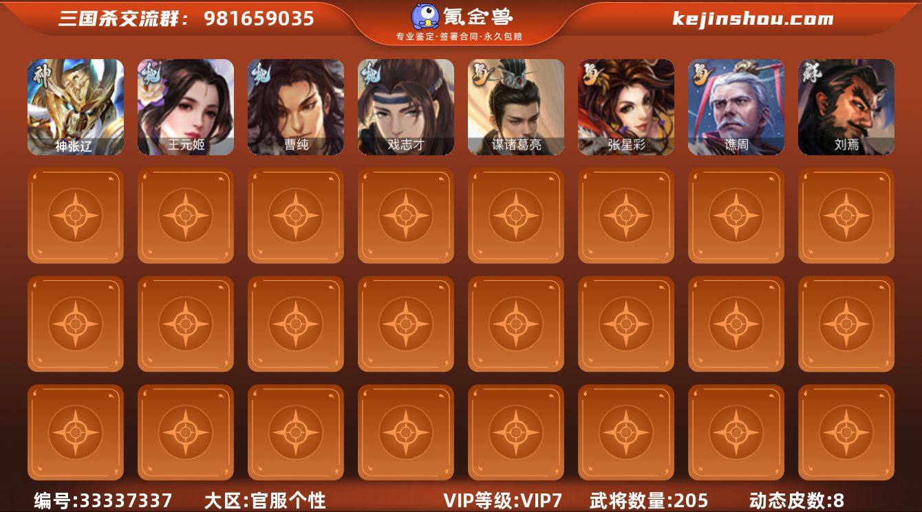 标题:S37177 【支持分期】 VIP等级:VIP7 官阶:领军将军 史诗武将数量:10 动态皮肤数量:8 史诗宝珠数量:16 将魂数量:2805 雁翎数量:15650 心愿积分:4147 史诗武将(魏国):王元姬,戏志才,程昱,曹纯 史诗武将(蜀国):谋诸葛亮,谯周,张星彩,马云禄 史诗武将(群雄):刘焉 史诗武将(神将):神张辽 其他亮点:欢乐豆72542