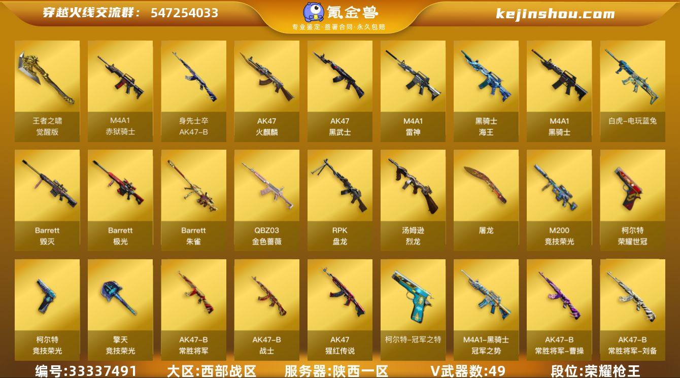 陕西一区-51V-1王者武器数-0炫金武器数 【热门武器】:QBZ03-金色蔷薇,M200-竞技荣光,白虎-电玩蓝兔,柯尔特-冠军之特,荣耀世冠-柯尔特,M4A1-黑骑士,汤姆逊-烈龙*6,RPK-盘龙*6,斯泰尔-蝴蝶,USP-雷暴,Knife-冠军之刃 【音效卡】:M4A1-黑骑士音效卡,绝迹语音包 【皮肤】:QBZ03-冠军之薇,雷神-荣耀之魄,火麒麟-雷神,火麒麟-冠军之心,火麒麟-盘古,火麒麟-巅峰荣耀,毁灭-冠军之怒,毁灭-黑大圣皮肤,黑骑士-冠军之势,战神-粉色甜心皮肤*2,战神-紫绶金章皮肤,AK47-B-常胜将军-曹操*2,AK47-B-常胜将军-刘备*3,屠龙-荣耀之锋 【角色】:零·纪元,战地猎狐,不败狙神,乔伊教练,修道士,云海玲珑,暗夜-X,风暴女,虎妞,潘多拉-X,蛇姬,铁骑荣耀,职业选手,潘多拉-N 【人偶武器】:斯泰尔-蝴蝶,生化手雷-机甲核心,闪光弹-貂蝉,高爆手雷-大乔,迷你超能女侍,灵狐娃娃手雷 【英雄级武器】:AK47-火麒麟,M4A1-雷神,M4A1-黑骑士,AK47-黑武士,QBZ03-金色蔷薇,AK-47-猩红传说,黑骑士-海王,AK47-B-常胜将军*2,白虎-电玩蓝兔,AK47-B-身先士卒,AK47-B-战士,Barrett-毁灭,Barrett-极光,Barrett-朱雀,M200-竞技荣光,RPK-盘龙*6,汤姆逊-烈龙*6,USP...