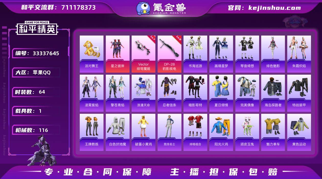 【956075】金鞋 眼罩苹果 手Q-1粉装-8特效枪-1载具-3粉色飞行器-31820热力值-4王牌印记-64套装-116枪皮 【热门品类】:套装-浪漫天命,套装-派对舞王,套装-忍者信条,套装-暗影哥特 【粉色套装】:粉装-星之彼岸 【粉色枪皮等级】:Vector-绯穹魔姬(七级),AKS-74U-森灵之息(五级),Mk14-福马献瑞(五级),AA12-G-萌骑幻想(四级),DP-28-豹影疾电(五级),DP-28-鸢尾珑雾(三级),燃烧瓶-薄荷可可(五级) 【粉色载具】:纱华曳影 【粉色枪皮】:ACE32-百变纱华,Vector-绯穹魔姬,AKS-74U-森灵之息,Mk14-福马献瑞,AA12-G-萌骑幻想,DP-28-豹影疾电,DP-28-鸢尾珑雾,燃烧瓶-薄荷可可 【粉色飞行器】:炫彩糖果飞行器,精灵菇菇飞行器,六号石头人降落伞,纱华羽翼飞行器 【粉色降落伞】:幻影战神降落伞,沙丘之主降落伞,异瞳寒姬降落伞,炫彩糖果降落伞,暮色玫影降落伞,百变纱华降落伞 【稀有套装】:套装-雪国风尚,套装-炫彩糖果,角色-幸运青,套装-马上有钱,套装-遗迹猎人,套装-朱霞炽焰,套装-凌霄紫焰,套装-擎苍青焰,角色-绯色魅影,套装-书海巡游,套装-画境星梦,套装-琴音绮想,套装-钻光豹影,套装-雨过天青,套装-红釉青花,套装-燕雀桃枝 【稀有枪皮】:AU...