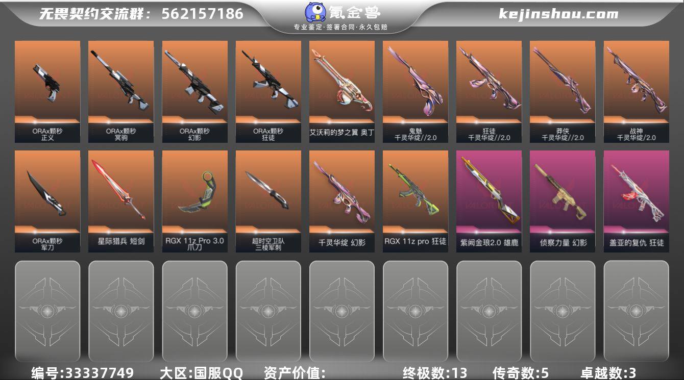 【套装】:千灵华绽//2.0套装,ORA x 颗秒套装 【英雄】:幻棱,炼狱,维斯,暮蝶,壹决,铁臂,捷风,雷兹,幽影,不死鸟,贤者,猎枭,蝰蛇,零,芮娜,奇乐,尚勃勒,霓虹,斯凯,夜露,星礈,K/O,盖可,黑梦,钢锁 【近战武器】:近战武器-碎心裂刃,近战武器-流风回雪,近战武器-ORA x 颗秒 军刀,近战武器-超时空卫队 三棱军刺,近战武器-RGX 11z Pro//3.0 爪刀,近战武器-星际猎兵 短剑 【狂徒】:狂徒-RGX 11z Pro,狂徒-ORA x 颗秒,狂徒-千灵华绽//2.0,狂徒-盖亚的复仇 【幻影】:幻影-千灵华绽,幻影-ORA x 颗秒,幻影-侦察力量 【冥驹】:冥驹-ORA x 颗秒 【莽侠】:莽侠-千灵华绽//2.0 【战神】:战神-千灵华绽//2.0 【奥丁】:奥丁-艾沃莉的梦之翼 【雄鹿】:雄鹿-紫阙金琅//2.0 【骇灵】:骇灵-无限竞技 【正义】:正义-ORA x 颗秒 【鬼魅】:鬼魅-千灵华绽//2.0,鬼魅-扑棱扑棱 【卡面】:无畏契约:暮蝶 卡面,Clutch 卡面,无畏契约GO!第一卷:芮娜 卡面,无畏契约GO!第一卷:零 卡面,《双城之战》金克丝 卡面,钢锁vs盖可 卡面,代号红色 卡面,新兵报到 卡面,V契约 卡面,无畏契约 卡面 【喷漆】:伤心心 喷漆,霓光四射 喷漆,买装还是存钱 喷漆,...