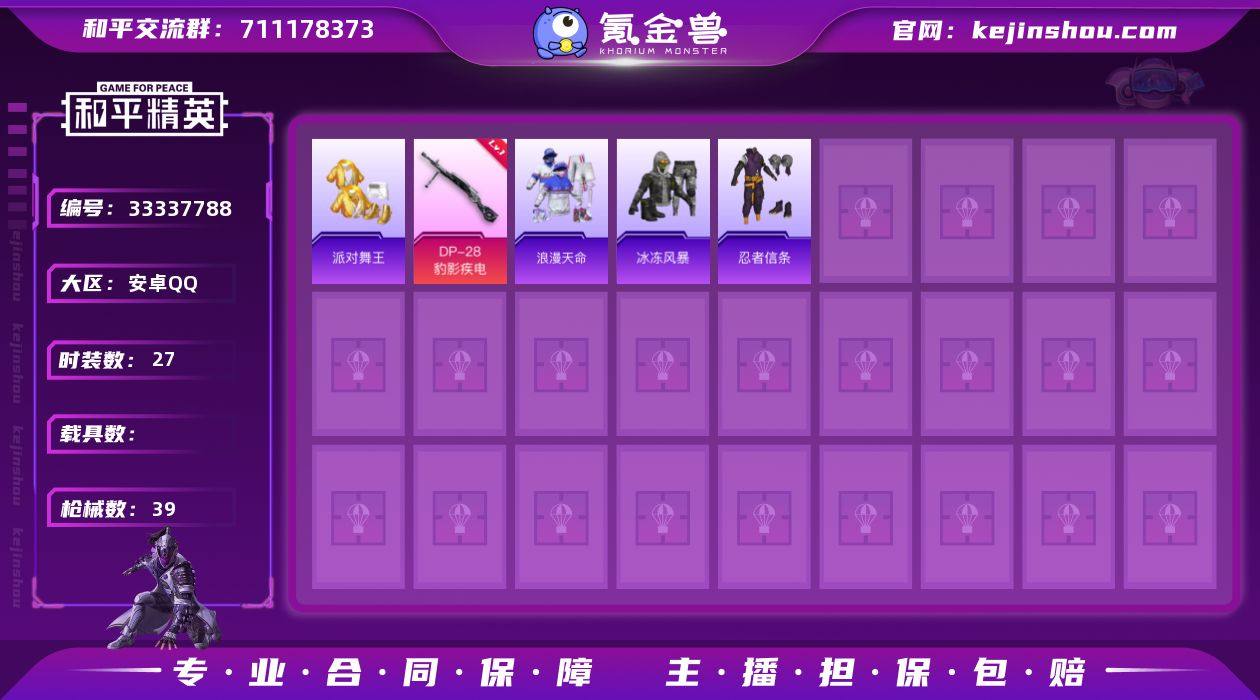 M1047595【1特效枪 金鞋子派对舞王,浪漫天命,忍者信条】安卓手Q-1特效枪-27套装-39枪皮-1王牌印记-荣耀皇冠Ⅲ-8285热力值【1特效枪】DP-28-豹影疾电[2级]【3稀有】派对舞王,浪漫天命,忍者信条【1头盔】深海小丑鱼头盔【62其它衣服和枪皮】白色伏地魔,萌鸡速递,冷焰舞者,遗迹猎人,雨过天青,薄荷星砂,冷酷挑战者,特战英豪,SS36特训,幻影武者,燕雀桃枝,元素星魂,龙的传人,SS37特训,黄色运动,SS38特训,魅力单车,阳光火鸡,角色-枫露凝珀,红釉青花,SS35特训,银夜幻翼,海岛探路者,冰冻风暴,UMP45-海盐豹豹,Mini14-鸡智如我,MG-36-薄荷星砂,AWM-天降萌叽,平底锅-锦灰蝶梦,AA12-G-雨过天青,SCAR-L-夜灯,大砍刀-像素花束,M338-锦灰蝶梦,GROZA-福马献瑞,M417-锦灰蝶梦,ARX-像素花束,AMR-雨过天青,P18C-龙虾霸霸,PKM-雨过天青,S1897-锦灰蝶梦,MP7-G-锦灰蝶梦,短管霰弹-星穹咏叹调,蜜獾-启元战纹,汤姆逊-鸢尾珑雾,UZI-影袭,MG3-鸢尾珑雾,UZI-金玉无双,M762-天降萌叽,AUG-耀粉歌者,M16A4-雨过天青,蝎式手枪-六号石头人,平底锅-诸神·破晓,SKS-炫彩节奏,莫辛纳甘-鸢尾珑雾,Mini14-耀粉歌者,Vector-龙虾霸霸,MG3-幻世战舞者,沙漠之鹰-雨过天青,QBU-乌木金纹,AKS-74U-乌木金纹,Win94-乌木金纹,SLR...