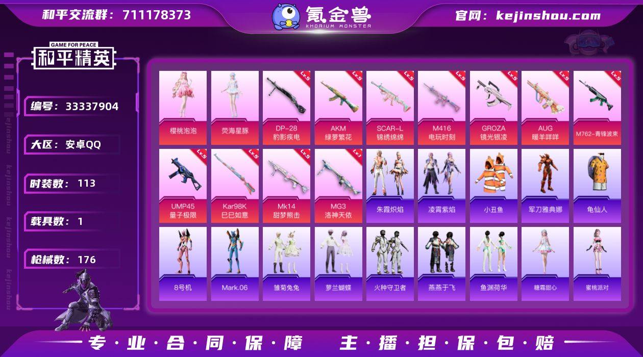 安卓 手Q-2粉装-14特效枪-1载具-3粉色飞行器-51875热力值-10王牌印记-113套装-176枪皮 【热门品类】:套装-小丑鱼,角色-军刀雅典娜,套装-龟仙人,角色-8号机,角色-Mark.06 【粉色套装】:角色-樱桃泡泡,角色-荧海星豚 【粉色枪皮等级】:AKM-绿萝繁花(五级),SCAR-L-锦绣绵绵(五级),M416-电玩时刻(五级),GROZA-镜光银凌(五级),AUG-暖羊咩咩(五级),M762-青锋波束(五级),ACE32-萌骑漫游(五级),UMP45-量子极限(五级),AKS-74U-森灵之息(五级),Kar98K-巳巳如意(五级),Mk14-甜梦熊击(五级),Mk14-福马献瑞(五级),DP-28-豹影疾电(五级),MG3-洛神天依(一级) 【粉色载具】:法拉利Roma(碧空蓝) 【粉色枪皮】:AKM-绿萝繁花,SCAR-L-锦绣绵绵,M416-电玩时刻,GROZA-镜光银凌,AUG-暖羊咩咩,M762-青锋波束,ACE32-萌骑漫游,UMP45-量子极限,AKS-74U-森灵之息,Kar98K-巳巳如意,Mk14-甜梦熊击,Mk14-福马献瑞,DP-28-豹影疾电,MG3-洛神天依 【粉色飞行器】:炫彩糖果飞行器,繁龙极客飞行器,戏水时光飞行器 【粉色降落伞】:洛神天依降落伞,环太平洋降落伞,莲影清波降落伞,繁龙极客降落伞,精灵梦叶罗丽降落伞,幻影飞狐降落伞,樱桃泡泡降落伞,炫彩糖果降落伞...