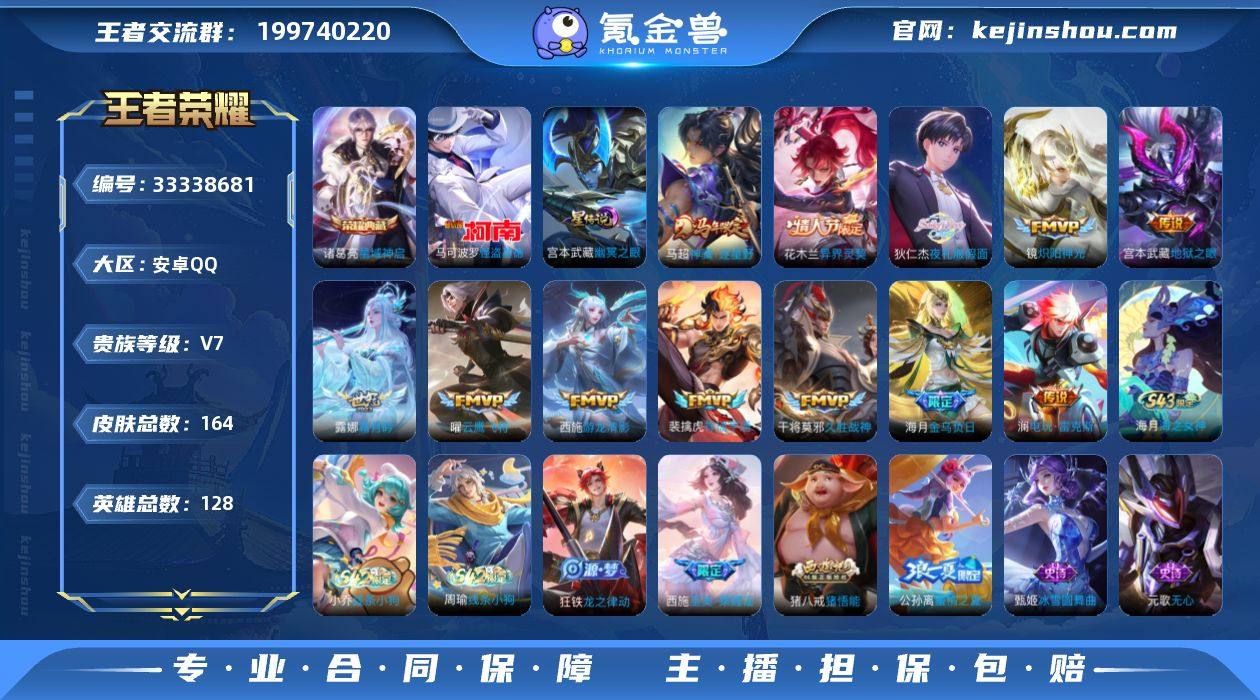 安卓Q-V7-至尊星耀I段位-128英雄-164皮肤-1典藏皮肤-1珍品传说-12传说-38史诗 【英雄全皮】:孙权全皮,敖隐全皮 【荣耀典藏】:诸葛亮星域神启 【珍品传说】:马可波罗怪盗基德 【传说皮肤】:马超神骥逐星野,花木兰异界灵契,裴擒虎祥瑞亨通,海月金乌负日,露娜霜月吟,狄仁杰夜礼服假面,澜电玩雷克斯,西施游龙清影,镜炽阳神光,曜云鹰飞将,干将莫邪久胜战神,宫本武藏地狱之眼 【限定皮肤】:姜子牙天穹之誓,狄仁杰阴阳师,赵云皇家上将,墨子神迹守卫,孙尚香蔷薇恋人,元歌无心,狄仁杰魔术师,达摩沙漠行僧,项羽海滩派对,老夫子航海奇遇记,程咬金演武夺筹,兰陵王金庭之子,后羿圣弓游侠,李元芳云中旅人,钟馗驱傩正仪,干将莫邪真爱魔法,鬼谷子五谷丰年,苏烈千军破阵,梦奇顽趣,公孙离蜜橘之夏,沈梦溪大漠名商,裴擒虎擒涛扼浪,猪八戒猪悟能,嫦娥拒霜思,西施至美乘鲤谣,桑启海盐诗旅,张良古海寻踪,狄仁杰夜礼服假面,蒙犽百解令,鬼谷子天穹祈灯,沈梦溪龙舞盛年,鲁班七号蔬乡物语,李元芳蔬乡物语,海月金乌负日,刘邦剑破天穹 【赛季限定】:程咬金演武夺筹,钟馗驱傩正仪,苏烈千军破阵,达摩沙漠行僧,兰陵王金庭之子,沈梦溪大漠名商,李元...