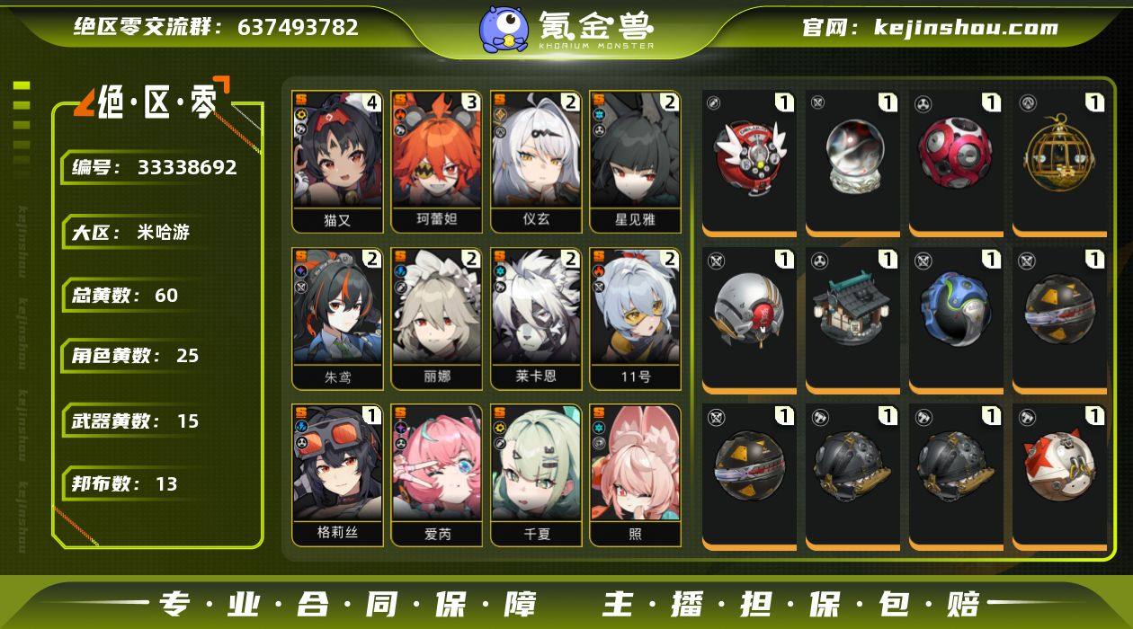送一个崩铁满级号!超值【等级】60 【黄数】60 【菲林】648 【加密母带】4 【S级代理人】0命千夏,0命照,0命卢西娅,0命爱丽丝,0命柚叶,0命叶瞬光,0命橘福福,2命仪玄,0命薇薇安,0命耀嘉音,0命青衣,2命朱鸢,2命星见雅,0命悠真,0命奥菲丝,0命零号安比,0命艾莲,0命爱芮,0命扳机,2命11号,2命莱卡恩,3命珂蕾妲,4命猫又,2命丽娜,1命格莉丝 【A级代理人】6命潘引壶,6命苍角,6命波可娜,6命派派,6命露西,6命妮可,5命安比,6命本,6命可琳,6命比利,6命赛斯,6命安东,4命真斗 【S级音擎】精1云霓孤光,精1十方锻星,精1思络成歌,精1拘缚者,精1拘缚者,精1深海访客,精1燃狱齿轮,精1牺牲洁纯,精1硫磺石,精1硫磺石,精1钢铁肉垫,精1钢铁肉垫,精1防暴者,精1霰落星殿,精1青溟笼舍 【S级邦布】精5罗宾,精3艾丝弥小姐,精3格列佛探员,精1墨丘利,精1狮耶,精1咔嚓仔,精1巴特勒,精1左轮布,精1鲨牙布,精1共鸣布,精1飚速布,精1阿饭,精1芽芽 【时装】水晶灯下,晴澜双迹套装,漪光夜曲,百里香之海,墨形影踪,狡黠甜心,白心旧影,晴空化狸 连体号!