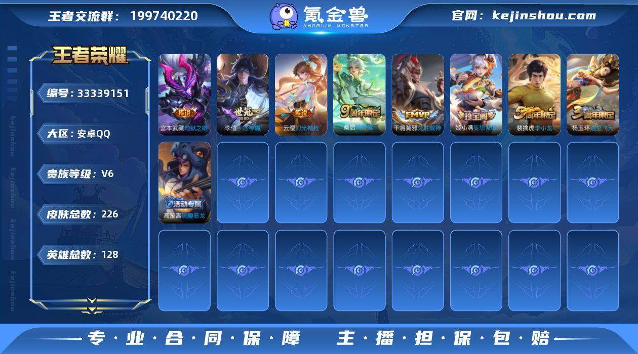 安卓q-4传说-128英雄-226皮肤-2内测 玩趣恶龙 妄想食味 1荣耀水晶(已兑换) 鸣剑曳影 万灵启世 逐花归海 幻光神枪 愿照九州拓 鸣野蒿 逐霄之志 拒霜思 神迹守卫钟馗 冰冠公主 暗影游猎 原初追逐者 电玩小子 龙骑士 久胜战神 一念神魔 时之恋人男 黄忠百相守梦 器灵浮梦炉 地狱之眼 东方月初 燃音魔法 伽罗琥珀纪元 百解令 天秀启明 原初探秘者 李小龙 暗隐猎兽者 猫狗日记男 金属风暴 地狱岩魂 特工魅影 曙光守护者 心灵骇客 幽灵船长 乘风破浪 末日机甲男 赏金猎手 节奏热浪 天才门将 绅士熊喵 偶像歌手 街头霸王 暗渊魔法 缤纷独角兽 鬼剑武藏 冰雪圆舞曲 青焰无极 花好人间 苍威无极 重明 穷奇 御狮 御霄 御旌 混沌棋 疑决卦 醍醐杖 万华元夜 演武夺筹 群星魔术团程咬金 驱傩正仪 未来纪元赵云 拳王 沙漠行僧 女仆咖啡 敏锐之力 海盐诗旅 皇家上将 魅力维加斯 探海日志 水果甜心 古海寻踪 天穹祈灯 埋骨钱 星界游侠 地狱燃心 江河有灵 荣光圣徽 顽岩魄 纤云弄巧 遇见飞天 乱世虎臣 鹰眼统帅 魔术师 王者荣耀账号