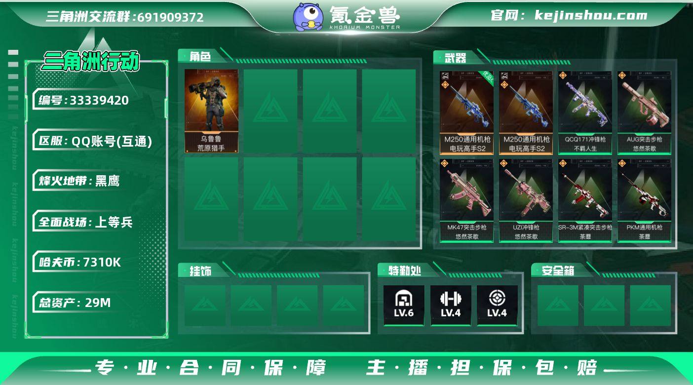 【SJZQH1751】总资产29M/哈夫币731万/传说近战数1/传说枪皮数13/战场等级13/行动等级60/安全箱等时效性道具以游戏内数据为准,详情请看图/乌鲁鲁-荒原猎手/近战-处刑者2级/近战-黑鹰/M250通用机枪-电玩高手S2/优品C典藏武器外观-M250通用机枪-电玩高手S2/AUG突击步枪-悠然茶歇/SCAR-H战斗步枪-启航/MK47突击步枪-悠然茶歇/UZI冲锋枪-悠然茶歇/SR-3M紧凑突击步枪-荼蘼/勇士冲锋枪-能天使-午夜邮差/QCQ171冲锋枪-不羁人生/PKM通用机枪-荼蘼/M14射手步枪-蛮荒/M14射手步枪-缄花/SR-25射手步枪-缄花/.357左轮-缄花/K416突击步枪-腊梅/SG552突击步枪-深海恐惧/腾龙突击步枪-猎鳄行动/K437突击步枪-丛林谍踪/P90冲锋枪-紧急戒备/Vector冲锋枪-猎鳄行动/SR-3M紧凑突击步枪-开工大吉/勇士冲锋枪-丛林谍踪/MP7冲锋枪-六套之力/PKM通用机枪-蝮蛇/PKM通用机枪-阿萨拉特攻/M249轻机枪-丛林谍踪/M250通用机枪-囚徒/QJB201轻机枪-炽焰/VSS射手步枪-丛林谍踪/M14射手步枪-工业狂潮/SCAR-H战斗步枪-休闲时光/SG552突击步枪-2026/SG552突击步枪-马年新春/SG552突击步枪-贴花艺术/ AK-12突击步枪-马年新春/CAR-15突击步枪-来财/K437突击步枪-生存指令/KC17突击步枪-来财/MK47突击步枪-精英联盟/M...