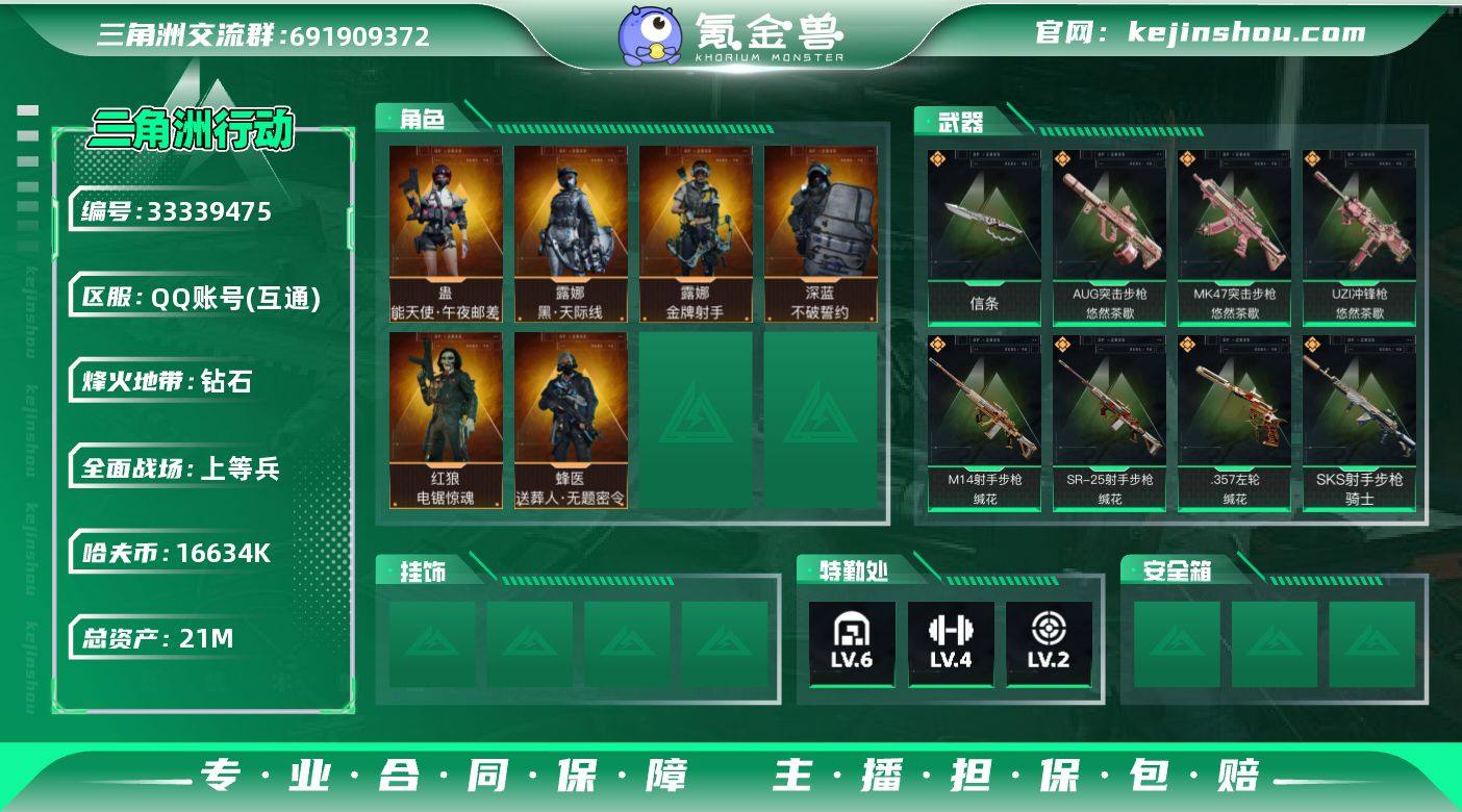【956103】【⭐ 可二次 2红1刀 卖号能回血 精品纯绿无处罚成品号 】 sjs10796 21m总资产-16634k哈夫币-60烽火等级-钻石-18战场等级-上等兵 【干员外观】:露娜-黑·天际线,蛊-能天使午夜邮差,蜂医-送葬人·无题密令,深蓝-不破誓约,红狼-电锯惊魂,露娜-金牌射手 【近战皮肤】:近战-信条,近战-黑鹰 【传说外观】:M4A1突击步枪-阿米娅,ASh-12战斗步枪-鹅鸭杀,M16A4突击步枪-狩猎时刻,AUG突击步枪-悠然茶歇,SG552突击步枪-运动员,AK-12突击步枪-特斯拉线圈,SCAR-H战斗步枪-启航,G3战斗步枪-狩猎时刻,G3战斗步枪-骑士,CAR-15突击步枪-阿米娅,K437突击步枪-几何解构,KC17突击步枪-电锯惊魂,MK47突击步枪-悠然茶歇,P90冲锋枪-信条,Vector冲锋枪-狩猎时刻,Vector冲锋枪-能天使-午夜邮差,UZI冲锋枪-特斯拉线圈,UZI冲锋枪-悠然茶歇,SR-3M紧凑突击步枪-特斯拉线圈,勇士冲锋枪-能天使-午夜邮差,QCQ171冲锋枪-鹅鸭杀,725双管霰弹枪-送葬人-无题密令,M250通用机枪-骑士之心,QJB201轻机枪-鹅鸭杀,M14射手步枪-蛮荒,M14射手步枪-缄花,SKS射手步枪-骑士,SR-25射手步枪-信条,SR-25射手步枪-缄花,R93狙击步枪-维什戴尔,.357左轮-缄花,复合弓-黑·天际线 【史...