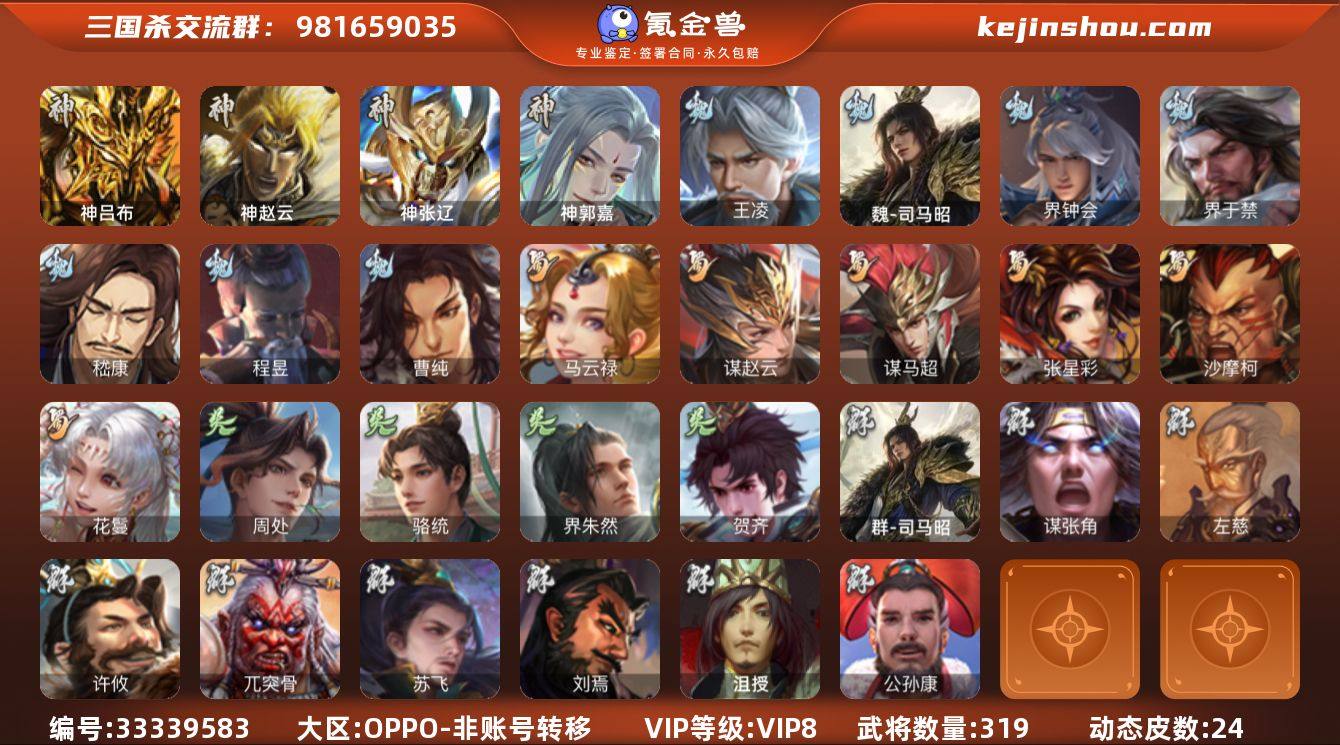 VIP等级: VIP8 官阶: 骠骑将军 武将数量: 319 动态皮肤数量: 24 神将: 神郭嘉,神吕布,神张辽,神赵云 魏国武将: 曹纯,程昱,嵇康,界于禁,界钟会,魏-司马昭,王凌 蜀国武将: 花鬘,沙摩柯,张星彩,谋马超,谋赵云,马云騄 吴国武将: 贺齐,界朱然,骆统,周处 群国武将: 公孙康,沮授,刘焉,苏飞,兀突骨,许攸,左慈,谋张角,群-司马昭 亮点: 欢乐豆27149,元宝52801