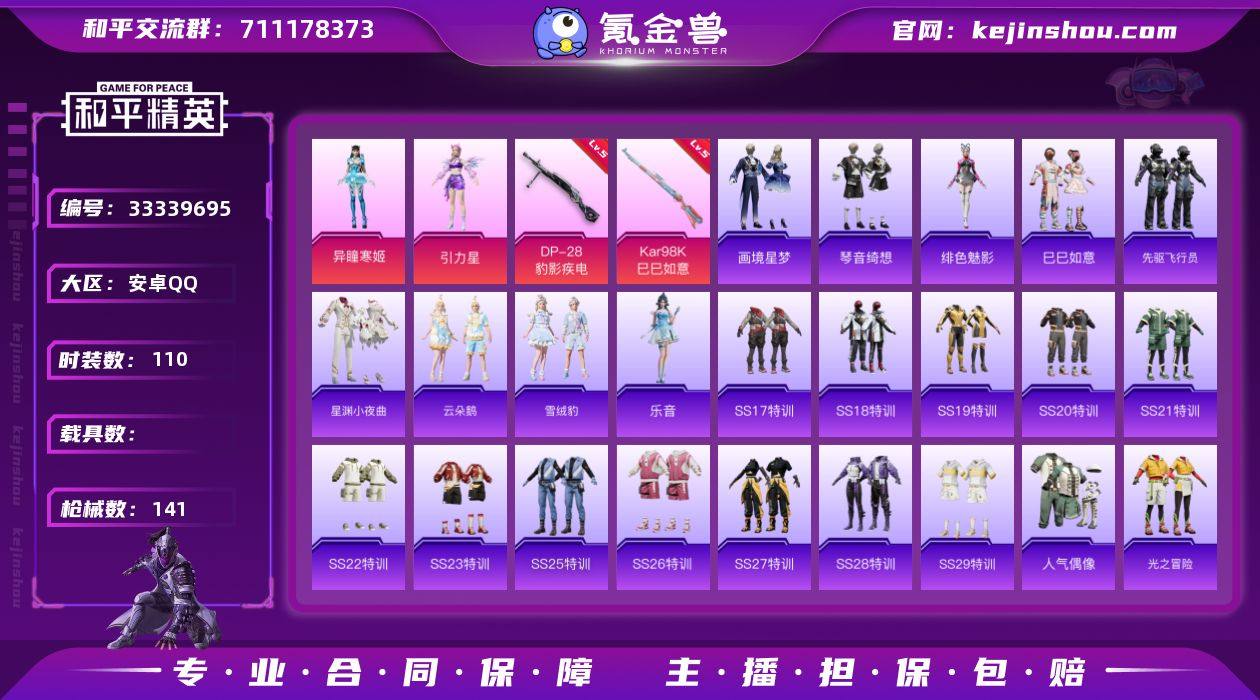 【kyhp1832】安卓 手Q-2粉装-4特效枪-0载具-1粉色飞行器-39356热力值-1王牌印记-110套装-141枪皮 【粉色套装】:角色-引力星,角色-异瞳寒姬 【粉色枪皮等级】:UMP45-萌骑冒险(五级),Kar98K-巳巳如意(五级),Mk14-福马献瑞(五级),DP-28-豹影疾电(五级) 【粉色枪皮】:UMP45-萌骑冒险,Kar98K-巳巳如意,Mk14-福马献瑞,DP-28-豹影疾电 【粉色飞行器】:炫彩糖果飞行器 【粉色降落伞】:暗夜玫瑰降落伞,洛神天依降落伞,沙丘之主降落伞,精灵梦叶罗丽降落伞,无垠阁降落伞,异瞳寒姬降落伞,炫彩糖果降落伞 【稀有套装】:套装-巳巳如意,套装-雪国风尚,套装-炫彩糖果,角色-奈斯,套装-马上有钱,套装-迅捷龙虾,套装-遗迹猎人,套装-先驱飞行员,套装-星渊小夜曲,套装-云朵鹅,套装-雪绒豹,角色-乐音,角色-绯色魅影,套装-画境星梦,套装-琴音绮想,套装-雨过天青,套装-红釉青花,角色-霜纹水星,角色-枫露凝珀 【稀有枪皮】:AKM-彩虹符号,AKM-破晓战魂,AKM-萌趣颜团子,AKM-虎虎生威,AKM-龙的传人,M16A4-幻世战舞者,SCAR-L-夜灯,SCAR-L-炫彩节奏,SCAR-L-玉兔迎春,SCAR-L-红色方程式,M416-夜灯,M416-糯团青竹,M416-蓝色火焰,QBZ-彩虹符号,QBZ-洛神天...
