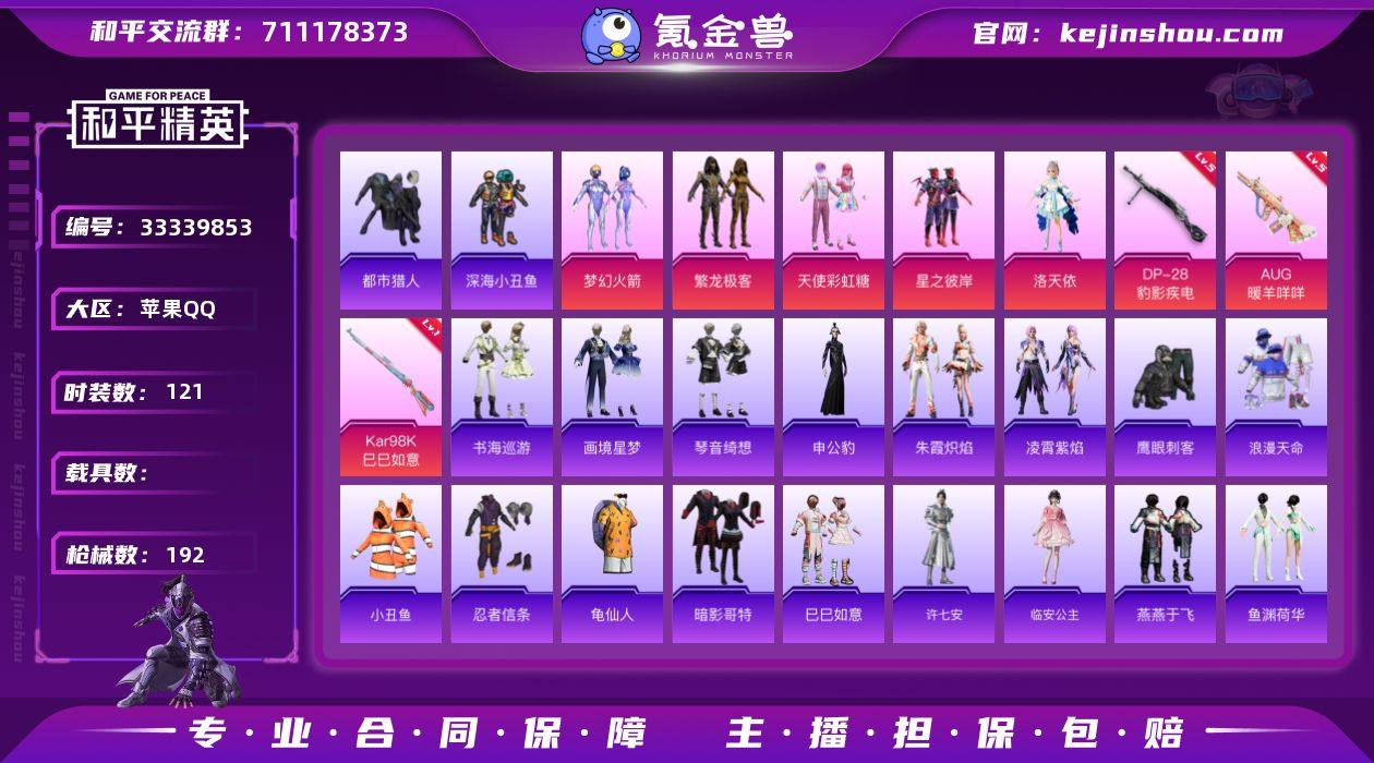 【8542】5粉装-3特效枪-0载具-0粉色飞行器-51945热力值-13王牌印记-121套装-192枪皮 【热门品类】:粉装-梦幻火箭,粉装-繁龙极客,套装-浪漫天命,套装-都市猎人,套装-深海小丑鱼,套装-小丑鱼,套装-忍者信条,套装-龟仙人,套装-暗影哥特 【粉色套装】:粉装-天使彩虹糖,粉装-梦幻火箭,粉装-星之彼岸,角色-洛天依,粉装-繁龙极客 【粉色枪皮等级】:AUG-暖羊咩咩(五级),Kar98K-巳巳如意(一级),DP-28-豹影疾电(五级)