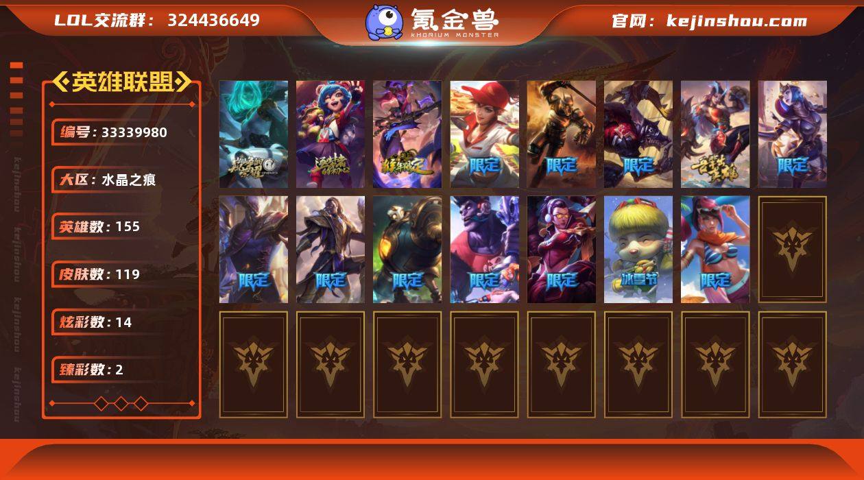 【LSA1473】155英雄/119皮肤/2神话/14限定/2臻彩/14炫彩/11传说/36史诗/未定级账号等级:294/10周年 安妮/源代码 乐芙兰/冠军之矛 卡莉丝塔 凯旋圣装/玉净夜叉 凯特琳/龙马烈焰波比/圣诞开心鬼 提莫/送披萨的小姐姐 希维尔/S2 暗杀星 蒙多/S3 SKT T1 薇恩/胜利女神 奥莉安娜/胜利之剑 亚托克斯/胜利枪神 卢锡安/胜利机器人 布里茨/泳池派对 菲奥娜/都铎王朝 图奇/玉剑传说 舞龙卫/警用试作体K-9 内瑟斯/地狱之门卫士 加里奥/源计划:林 易/霸天零式 赛恩/提莫:"约德尔人的一大步"/绅士 科加斯/最终BOSS 维迦/银河魔装机神 兰博/战斗学院 伊泽瑞尔/泳池派对 吉格斯/霸天异形 卡兹克/灌篮高手 德莱厄斯/圣光审判 凯尔/铁血剑豪 易/女船长 厄运小姐/国王 泰达米尔/刀锋女王 莫甘娜/炼金狂士 辛吉德/死神 卡尔萨斯/小小骑士 阿木木/熔火之心 拉莫斯/掠星魔刃 卡萨丁/穿着正装的恶魔 维迦/前线指挥官 卡特琳娜/源计划:雄心 卡特琳娜/死亡绽放 伊莉丝/暗星 奥莉安娜/V字仇杀者 布兰德/至高之拳 李青/法老王朝 内瑟斯/血色之锤 波比/大夏武士 潘森/刺客信条 凯南/铁甲雄心 盖伦/钢铁烈阳 蕾欧娜/血色精锐 锐雯/战国大名 慎/奥术光辉 拉克丝/银河魔装机神 菲兹/铁血猎人 雷恩加尔/暗星...