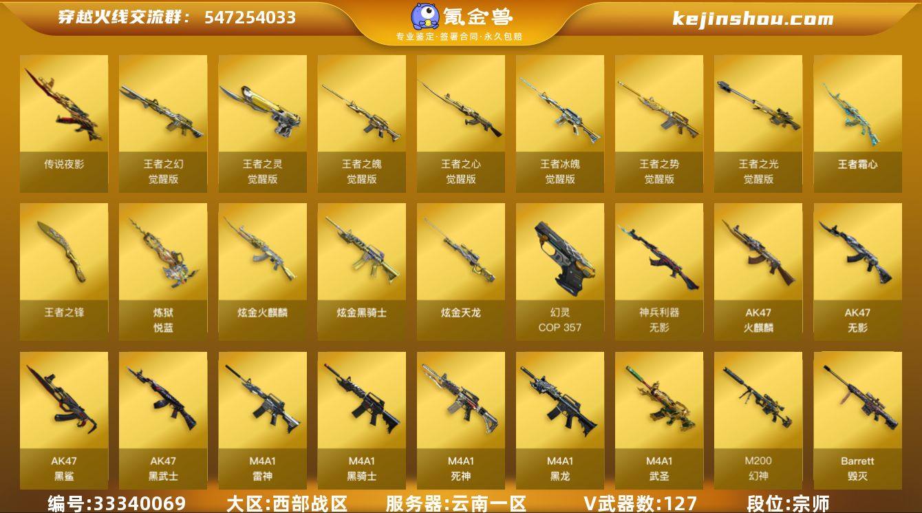 【ky6885】云南一区-142V-12王者武器数-3炫金武器数 【传说武器】:传说夜影 【传说角色】:传说艾莉莎 【热门武器】:传说夜影,QBZ03-金色蔷薇,M14EBR-玄武,M200-幻神,M200-竞技荣光,死亡之眼,Cat-刀锋,炼狱-迷你小钢*3,毒蜂,M4A1-黑骑士*2,汤姆逊-烈龙*6,RPK-盘龙*3,加特林-炼狱*2,斯泰尔-蝴蝶,COP 357-幻灵,沙鹰-修罗*4,炽芒蝶刃 【王者炫金武器】:王者霜心,炼狱-悦蓝,王者之锋,炫金火麒麟,炫金骑士,炫金天龙 【音效卡】:加特林-炼狱音效卡,屠龙-电竞之星-竞星跃动音效卡,M4A1-雷神音效卡,M4A1-黑骑士音效卡,Barrett-毁灭音效卡,HK417-朱雀-电竞之星-竞星跃动音效卡 【皮肤】:幻神-冠军之幻,M200-幻神-荣耀世冠白鲨,白虎-大汉风骨,QBZ03-荣耀世冠白鲨,雷神-星空,雷神-R.LGD-CFPLS18冠军,雷神-维纳斯皮肤,雷神-神秘按键 皮肤,炼狱-玩具枪皮肤,火麒麟-雷神*2,火麒麟-巅峰荣耀,火麒麟-大唐荣光,火麒麟-心动糖果,毁灭耀金皮肤,毁灭-星空,毁灭-冠军之怒,毁灭-英雄计划 皮肤,黑龙-暗月,黑骑士耀金皮肤,黑骑士-冠军之势,无影-霓裳皮肤,战神-粉色甜心皮肤,战神-紫绶金章皮肤,战神-流金岁月皮肤,AWM-天龙-传奇70KG,极光-能量...