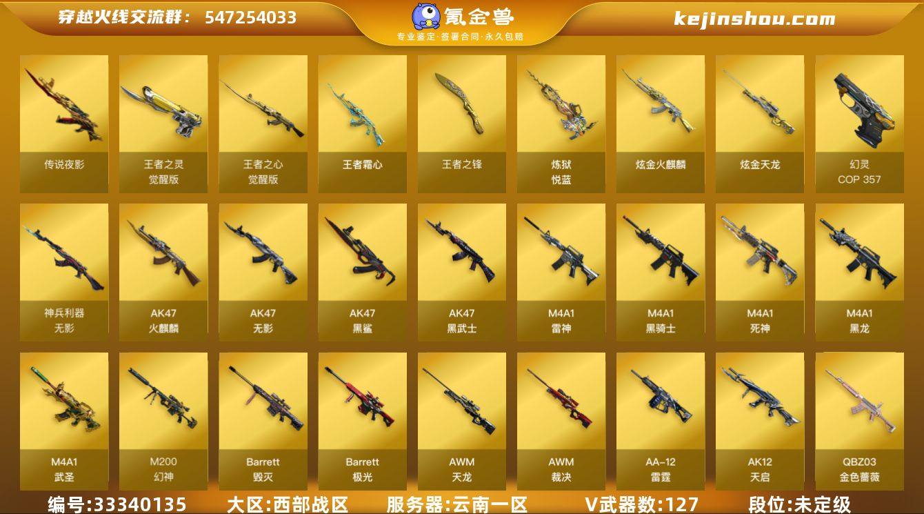 云南一区-142V-12王者武器数-3炫金武器数 【传说武器】:传说夜影 【传说角色】:传说艾莉莎 【热门武器】:传说夜影,QBZ03-金色蔷薇,M14EBR-玄武,M200-幻神,M200-竞技荣光,死亡之眼,Cat-刀锋,炼狱-迷你小钢*3,毒蜂,M4A1-黑骑士*2,汤姆逊-烈龙*6,RPK-盘龙*3,加特林-炼狱*2,斯泰尔-蝴蝶,COP 357-幻灵,沙鹰-修罗*4,炽芒蝶刃 【王者炫金武器】:王者霜心,炼狱-悦蓝,王者之锋,炫金火麒麟,炫金骑士,炫金天龙 【音效卡】:加特林-炼狱音效卡,屠龙-电竞之星-竞星跃动音效卡,M4A1-雷神音效卡,M4A1-黑骑士音效卡,Barrett-毁灭音效卡,HK417-朱雀-电竞之星-竞星跃动音效卡 【皮肤】:幻神-冠军之幻,M200-幻神-荣耀世冠白鲨,白虎-大汉风骨,QBZ03-荣耀世冠白鲨,雷神-星空,雷神-R.LGD-CFPLS18冠军,雷神-维纳斯皮肤,雷神-神秘按键 皮肤,炼狱-玩具枪皮肤,火麒麟-雷神*2,火麒麟-巅峰荣耀,火麒麟-大唐荣光,火麒麟-心动糖果,毁灭耀金皮肤,毁灭-星空,毁灭-冠军之怒,毁灭-英雄计划 皮肤,黑龙-暗月,黑骑士耀金皮肤,黑骑士-冠军之势,无影-霓裳皮肤,战神-粉色甜心皮肤,战神-紫绶金章皮肤,战神-流金岁月皮肤,AWM-天龙-传奇70KG,极光-能量核心,修罗...