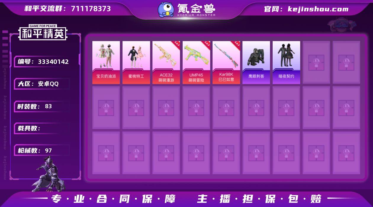 DYH18046【女号2粉装3特效 宝贝奶油派 小丑鱼】安卓手Q-2粉装-3特效枪-83套装-97枪皮-4王牌印记-坚韧铂金Ⅱ-27755热力值【2粉装】宝贝奶油派,蜜桃特工【3特效枪】ACE32-萌骑漫游[5级],Kar98K-巳巳如意[5级],UMP45-萌骑冒险[3级]【1稀有】小丑鱼【3飞行器】火焰蝠人飞行服,粉色滑翔尾迹,顶峰精英尾迹【3头盔】梦幻火箭头盔,童趣迷兔头盔,金羽特工头盔【2背包】夏日绵绵冰背包,金羽特工背包【174其它衣服和枪皮】元气发射,缤纷果语,微雨春柳,快乐星愿,幻世战舞者,锦衣飞扬,黄色伏地魔,柠萌假日,猛禽,绯格组合,星途旅人,街头潮人,SS30特训,白熊同盟,耀粉歌者,橘黑制服,鹰眼刺客,娇憨猪猪,纯真浪花,竞技达人朋克,人气偶像,SS25特训,角色-银尘,红色运动,黄色名流,特训学院,SS24特训,灵幻魔术师,猎梦纪元,SS32特训,玉兔迎春,湖蓝色名流,鹤鸣,SS21特训,SS31特训,酒红色名流,懵萌河马,战术大师,甜心亚梦,SS29特训,特殊使命,海盐绵绵冰,青年教官,神气柴柴,王牌教练,猎鹰,红釉青花,白色伏地魔,海岛探路者,虚音幻奏,冷焰舞者,热情海星,黑色伏地魔,魅力单车,冰川特警,龙的传人,元素星魂,蓝色运动,SS23特训,雨过天青,狙击之神,SS20特训,完美偶像,SS37特训,曼妙人鱼,萌趣咩咩,长空猛禽,深蓝色...