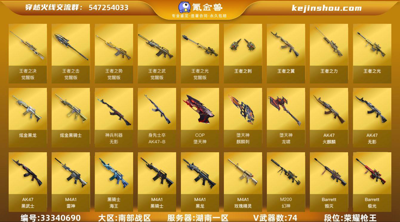 湖南一区-82V-9王者武器数-2炫金武器数 【热门武器】:QBZ03-金色蔷薇,M200-幻神,死亡之眼,荣耀世冠-雷神,荣耀世冠-柯尔特,M4A1-黑骑士,汤姆逊-烈龙*6,RPK-盘龙*6,加特林-炼狱,羊驼玩偶,COP-堕天神,沙鹰-修罗*2 【王者炫金武器】:王者之翼,王者之光,王者之力,王者之刺,炫金骑士,炫金黑龙 【音效卡】:M4A1-黑骑士音效卡,Barrett-毁灭音效卡,Barrett-极光音效卡 【皮肤】:幻神-冠军之幻,雷神-暗月,雷神-能量核心,雷神-星空,火麒麟-雷神,AK47-火麒麟-传奇EVEN,毁灭-暗月,毁灭耀金皮肤,毁灭-冠军之怒,M4A1-千变-孔明皮肤,黑骑士-暗月,黑骑士耀金皮肤,无影-能量核心*2,无影耀金皮肤,战神-粉色甜心皮肤,战神-紫绶金章皮肤,战神-流金岁月皮肤,AK47-B-常胜将军-曹操,AK47-B-常胜将军-孙权*3,AWM-天龙-传奇70KG,极光-能量核心,修罗-能量核心,天神-暗月*3 【角色】:葵,炫,迷迭香,王者春,王者-救世主,王者玲珑-小乔,乔伊教练,修道士,空,暗夜-X,风暴女,嘉年华灵狐,娟娟,兰-新年限定,灵狐者-黄金海岸,龙儿,潘多拉-X,青霞仙子,蜀雪,铁骑荣耀,雪莉杨,影武者-X 【人偶武器】:巴雷特-零-水下丽影,AWM-灵狐-15周年嘉年华,...