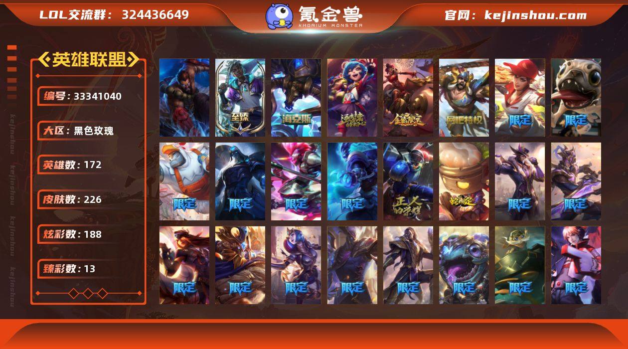 【956161】未定级段位-172英雄-226皮肤-188炫彩-1终极-3神话-38限定-21传说-49史诗 【神话皮肤】:十周年纪念安妮 【至臻皮肤】:至臻星之守护者艾克 【海克斯皮肤】:海克斯科技阿利斯塔 【臻彩皮肤】:冠军典狱长锤石凯旋圣装,玉剑传说无影竞星,天煞劫恒星游历者,玉剑传说琴仙子丁香,霸天异形卡兹克刹那银光,魔女阿卡丽虚荣,花仙子崔丝塔娜蓝闪,黑夜使者嘉文四世白夜 【年限皮肤】:金猪烈焰瑟庄妮,点心宝贝阿木木,龙马烈焰波比 【冰雪限定】:雪装奈德丽,寒冬精灵璐璐,北极星猎人斯维因 【终极皮肤】:灵魂守卫乌迪尔 【限定皮肤】:送披萨的小姐姐希维尔,冠军典狱长锤石,冠军之志瑞兹,Fnatic库奇,暗杀星伊泽瑞尔,SSW泰隆,SKTT1娜美,SSG塔莉垭,FPX普朗克,FPX墨菲特,FPX李青,FPX薇恩,FPX锤石,暗裔英雄盖伦,胜利女神希维尔,胜利之树茂凯,胜利女神奥莉安娜,胜利之剑亚托克斯,胜利枪神卢锡安,胜利巨口克格莫,胜利剑圣易,胜利之运崔斯特,胜利女神菲奥娜,鬼影森森茂凯,野兽猎人泰达米尔,勇者阿狸,电玩战魂赫卡里姆,防暴天使凯尔,海之歌艾希,鸡里奥,克格汪 【传说皮肤】:魔幻卡牌崔斯特,大天使长米迦勒凯尔,提莫约德尔人的一大步,欧...