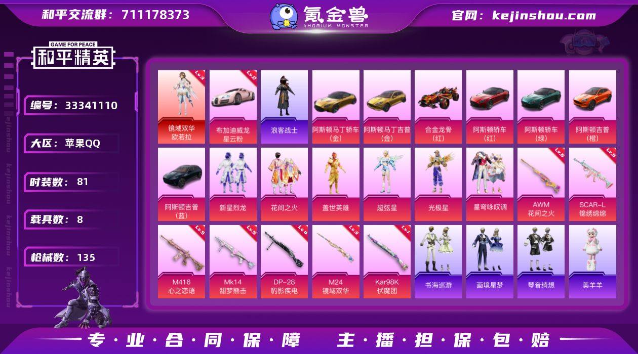 【kyhp1835】苹果 手Q-1神装-7粉装-11特效枪-8载具-1粉色飞行器-66177热力值-5王牌印记-81套装-135枪皮 【红色载具】:布加迪威龙(星云粉)(二级) 【红色神装等级】:镜域双华-欧若拉(三级) 【红色角色神装】:镜域双华-欧若拉 【热门品类】:套装-浪客战士,套装-龟仙人 【粉色套装】:粉装-新星烈龙,粉装-花间之火,粉装-盖世英雄,角色-超弦星,角色-光极星,粉装-星穹咏叹调,角色-罪夜之冕 【粉色枪皮等级】:SCAR-L-锦绣绵绵(五级),M416-心之恋语(五级),AUG-罪夜之冕(五级),ACE32-萌骑漫游(三级),AKS-74U-森灵之息(五级),Kar98K-伏魔团(一级),M24-镜域双华(三级),AWM-花间之火(六级),Mk14-甜梦熊击(五级),Mk14-福马献瑞(五级),DP-28-豹影疾电(四级) 【粉色载具】:布加迪威龙(星云粉),阿斯顿马丁DBS(红),阿斯顿马丁DBS(绿),阿斯顿马丁DBS(金),阿斯顿马丁DBX(橙),阿斯顿马丁DBX(蓝),阿斯顿马丁DBX(金),合金龙骨(红),空客H135-恋语之翼 【粉色枪皮】:SCAR-L-锦绣绵绵,M416-心之恋语,AUG-罪夜之冕,ACE32-萌骑漫游,AKS-74U-森灵之息,Kar98K-伏魔团,M24-镜域双华,AWM-花间之火,Mk14-甜梦熊击,Mk14-福马献瑞,DP-28-豹影疾电...