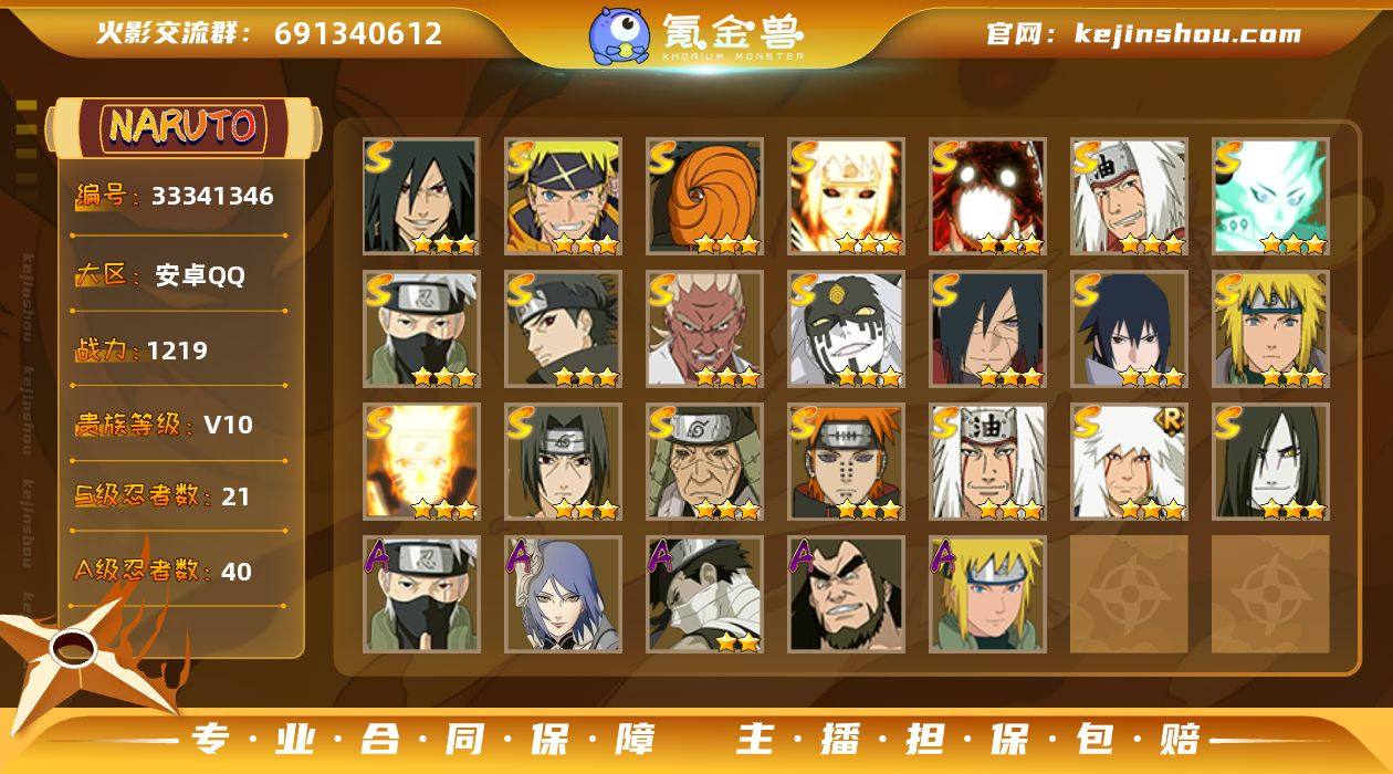 【火影忍者】战斗力:1219W+;段位:下忍1阶;本服排名:678;VIP:V10级;S忍:21个;A忍:40个;通灵兽:18个,S忍:秽土转生解宇智波斑|须佐能乎旗木卡卡西|九喇嘛连结波风水门|五影会谈宇智波斑|天道佩恩|传说中的三忍自来也|漩涡鸣人宇智波佐助|须佐能乎宇智波止水|永恒万花筒宇智波佐助|最终章大筒木舍人|忍界大战艾|舞之豪杰自来也|大蛇丸(普通)|波风水门|神驹佑将宇智波斑|须佐能乎宇智波鼬|九喇嘛连结漩涡鸣人|大筒木桃式|秽土转生猿飞日斩|自来也(普通)|暴怒第六尾漩涡鸣人__A忍:青春爆炸迈特凯|妖怪奇谭纲手|仙人模式巳月|忍界大战李洛克|秽土转生角都|忍界大战日向宁次|四代目土影黑土|宇智波止水(普通)|不风|青年波风水门|青年艾|近松十人卫千代|晓大蛇丸|忍界大战秋道丁次|忍界大战我爱罗|奇拉比(普通)|万花筒写轮眼宇智波佐助|死司凭血飞段 * 4星|角都(普通)|地怨虞角都|疾风传我爱罗 * 3星|迪达拉(普通)|飞段(普通) * 4星|小南(普通)|神驹佑将小南|神威对决旗木卡卡西|迈特凯(普通) * 5星|宇智波鼬(普通)|干柿鬼鲛(普通) * 5星|秽土转生桃地再不斩|蝎(普通) * 4星|绯流琥蝎|猿飞阿斯玛(普通) * 5星|桃式显现漩涡博人|最终章日向雏田...