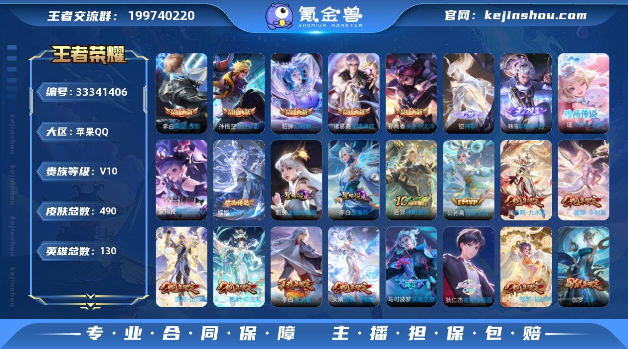 V10 6典藏 3无双 4珍品 55传说 2星元 490皮肤 130英雄 【6水晶】李白-鸣剑·曳影,孙尚香-杀手不太冷,孙悟空-全息碎影,诸葛亮-星域神启,貂蝉-幻阙歌【3无双】韩信-群星魔术团,铠-神罪【4珍品传说】嫦娥-器灵·落星盏,安琪拉-酷洛米之心,瑶-大耳狗之梦【55传说】李白-诗剑行,孙尚香-音你闪耀,马可波罗-深海之息,马超-无双飞将,达摩-黄金狮子座,貂蝉-仲夏夜之梦,貂蝉-猫影幻舞,伽罗-太华,干将莫邪-久胜战神,宫本武藏-地狱之眼,后羿-黄金射手座,花木兰-冠军飞将,李白-凤求凰,李信-一念神魔,刘备-时之恋人,吕布-天魔缭乱,梦奇-胖达荣荣,孙尚香-末日机甲,孙悟空-地狱火,武则天-海洋之心,小乔-音你心动,虞姬-云霓雀翎,虞姬-启明星使,赵云-淬星耀世,诸葛亮-武陵仙君,吕布-怒海麟威,宫本武藏-惊梅引,典韦-战鼓燎原,狄仁杰-夜礼服假面,王昭君-永恒水手月亮,兰陵王-影龙天霄,鲁班七号-时之奇旅,大乔-时之奇旅,云缨-鹤归松栖,露娜-霜月吟,艾琳-觅芳踪,澜-逐花归海,曜-云鹰飞将,嬴政-玄雷天君,云缨-幻光神枪,裴擒虎-祥瑞亨通,妲己-愿照·众生和,司空震-愿照·山河定,蔡文姬-愿照·福禄聚,虞姬-愿照·岁时盈,澜-愿照·九州拓,女娲-愿照·千秋盛,公孙离-云诺千山,后羿-神树通天【2星元】貂蝉-金色仲夏...