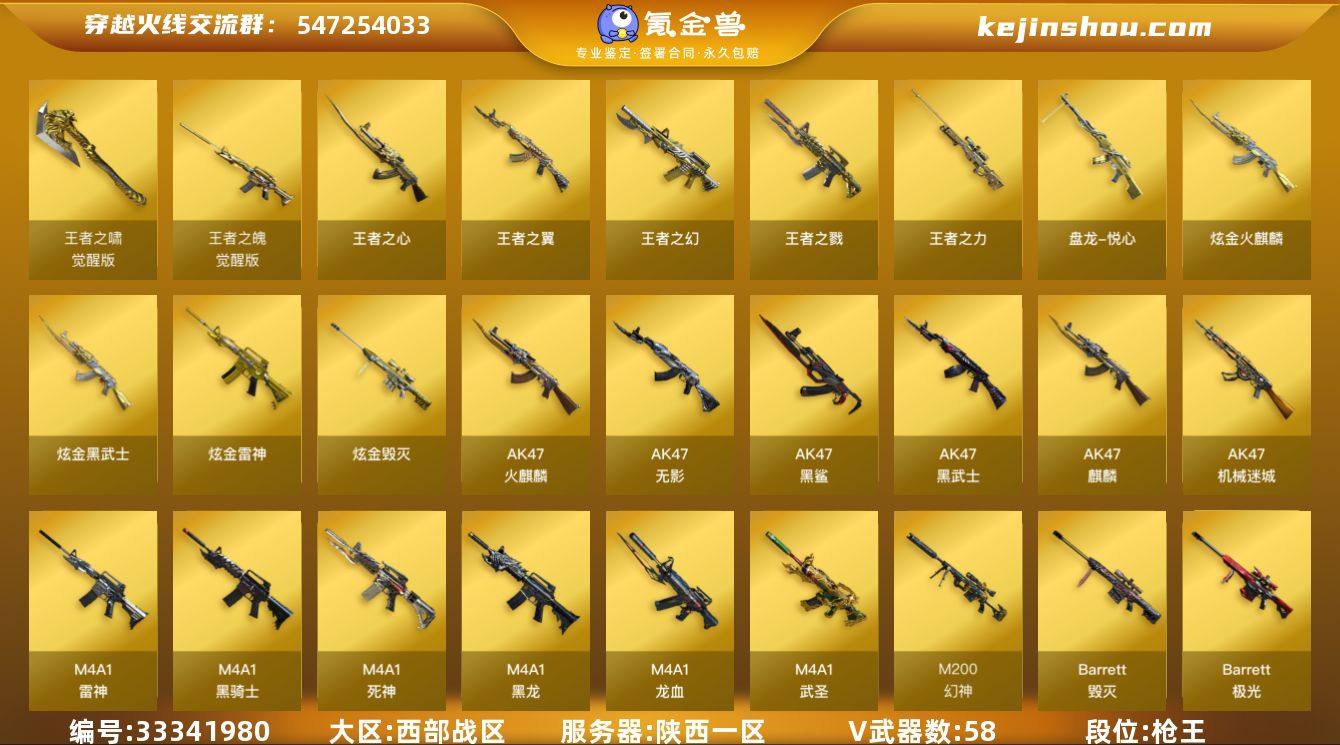 陕西一区-61V-8王者武器数-5炫金武器数 【热门武器】:QBZ03-金色蔷薇,M200-幻神,死亡之眼,C.A.T,M4A1-黑骑士,汤姆逊-烈龙*7,RPK-盘龙,加特林-炼狱*6,降世魔童,沙鹰-修罗*4 【王者炫金武器】:王者之戮,王者之幻,王者之翼,王者之心,王者之力,盘龙-悦心,炫金火麒麟,炫金雷神,炫金武士,炫金毁灭*2 【音效卡】:M4A1-雷神音效卡 【皮肤】:裁决-星际旅行 皮肤,雷神-能量核心,雷神-星空,火麒麟-雷神,毁灭-暗月,黑龙-能量核心,无影-暗月*4,无影-能量核心,死神-秘银,极光-能量核心,修罗-能量核心*2,龙啸-青青莓果 皮肤 【角色】:葵,王者之瞳,兰-新年限定,潘多拉-甜心教官,蜀雪,铁骑荣耀,兔囡囡,团团 【人偶武器】:C.A.T,迷你生化手雷,降世魔童 【暴走生化】:死亡之眼 【挑战大师】:AK47-冰龙粉碎者 【英雄级武器】:AK47-火麒麟,AK47-麒麟,M4A1-黑龙*2,M4A1-雷神*3,M4A1-黑骑士,AK47-无影,M4A1-死神,AK47-黑武士,AK12-天启,AN94-超新星,M4A1-武圣,AK47-机械迷城,AK47-黑鲨*4,M4A1-龙血,QBZ03-金色蔷薇,王者之魄-觉醒版,AWM-天龙,Barrett-毁灭*3,Barrett-极光*2,AWM-裁决,M200-幻神,RPK-盘龙,加特林-炼狱*6,汤姆逊...