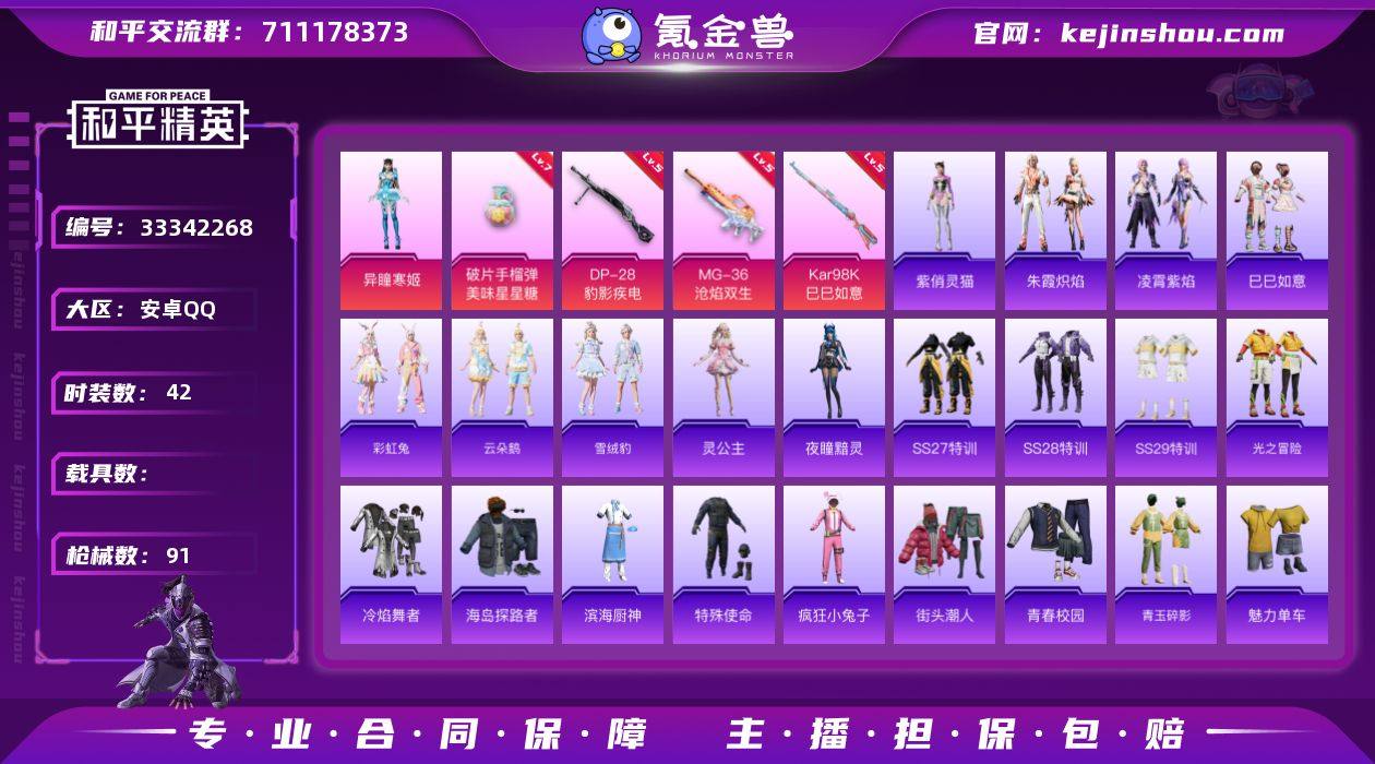 【kyhp1303】安卓 手Q-1粉装-5特效枪-0载具-1粉色飞行器-22855热力值-2王牌印记-42套装-91枪皮 【粉色套装】:角色-异瞳寒姬 【粉色枪皮等级】:Kar98K-巳巳如意(五级),Mk14-福马献瑞(二级),DP-28-豹影疾电(五级),MG-36-沧焰双生(五级),破片手榴弹-美味星星糖(七级) 【粉色枪皮】:Kar98K-巳巳如意,Mk14-福马献瑞,DP-28-豹影疾电,MG-36-沧焰双生,破片手榴弹-美味星星糖 【粉色飞行器】:炫彩糖果飞行器 【粉色降落伞】:绯穹魔姬降落伞,喜羊羊与灰太狼降落伞,异瞳寒姬降落伞,炫彩糖果降落伞 【稀有套装】:套装-巳巳如意,套装-彩虹兔,套装-云朵鹅,套装-雪绒豹,角色-灵公主,角色-夜瞳黯灵,套装-朱霞炽焰,套装-凌霄紫焰,角色-紫俏灵猫 【稀有枪皮】:AKM-影袭,AKM-破晓战魂,SCAR-L-夜灯,SCAR-L-炫彩节奏,M416-蓝色火焰,AUG-耀粉歌者,M762-天降萌叽,M762-云朵鹅,蜜獾-天降萌叽,蜜獾-绯穹魔姬,ARX-凌霄紫焰,UZI-红色方程式,UMP45-夜灯,UMP45-生命誓言,UMP45-蓝色火焰,Vector-生命誓言,汤姆逊-炫彩节奏,汤姆逊-耀粉歌者,JS9-凌霄紫焰,Kar98K-彩虹符号,Mini14-耀粉歌者,AMR-喜羊羊与灰太狼,SVD-云朵鹅,SVD-冷漠罗丽,S686-生命誓言,S686...