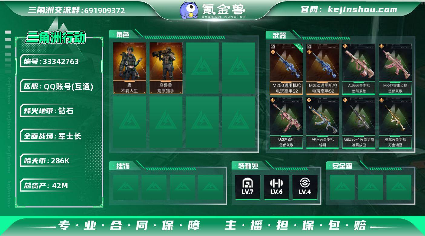 【5838】总资产42M/哈夫币28万/传说枪皮数12/战场等级23/行动等级60/安全箱等时效性道具以游戏内数据为准,详情请看图/乌鲁鲁-荒原猎手/蛊-不羁人生/近战-黑鹰/M250通用机枪-电玩高手S2/优品A典藏武器外观-M250通用机枪-电玩高手S2/AKM突击步枪-锦绣/QBZ95-1突击步枪-凌霄戍卫/AUG突击步枪-悠然茶歇/腾龙突击步枪-万金泪冠/K437突击步枪-锦绣/MK47突击步枪-悠然茶歇/UZI冲锋枪-悠然茶歇/SMG-45冲锋枪-锦绣/勇士冲锋枪-万金泪冠/M14射手步枪-蛮荒/AWM狙击步枪-万金泪冠/K416突击步枪-腊梅/K416突击步枪-阿萨拉特攻/AUG突击步枪-蝮蛇/K437突击步枪-丛林谍踪/MP5冲锋枪-深海恐惧/SR-3M紧凑突击步枪-开工大吉/勇士冲锋枪-丛林谍踪/MP7冲锋枪-六套之力/PKM通用机枪-蝮蛇/M249轻机枪-丛林谍踪/QJB201轻机枪-炽焰/VSS射手步枪-丛林谍踪/SVD狙击步枪-阿萨拉工艺/M14射手步枪-工业狂潮/M700狙击步枪-蝮蛇/M700狙击步枪-哈夫克警备/AKS-74U突击步枪-休闲时光/K416突击步枪-一帆风顺/SG552突击步枪-马年新春/SG552突击步枪-贴花艺术/ AK-12突击步枪-马年新春/SCAR-H战斗步枪-荣耀列队/CAR-15突击步枪-来财/KC17突击步枪-来财/Vector冲锋枪-先锋/SMG-45冲锋枪-行动开启/SR-3M紧凑突击步枪-...