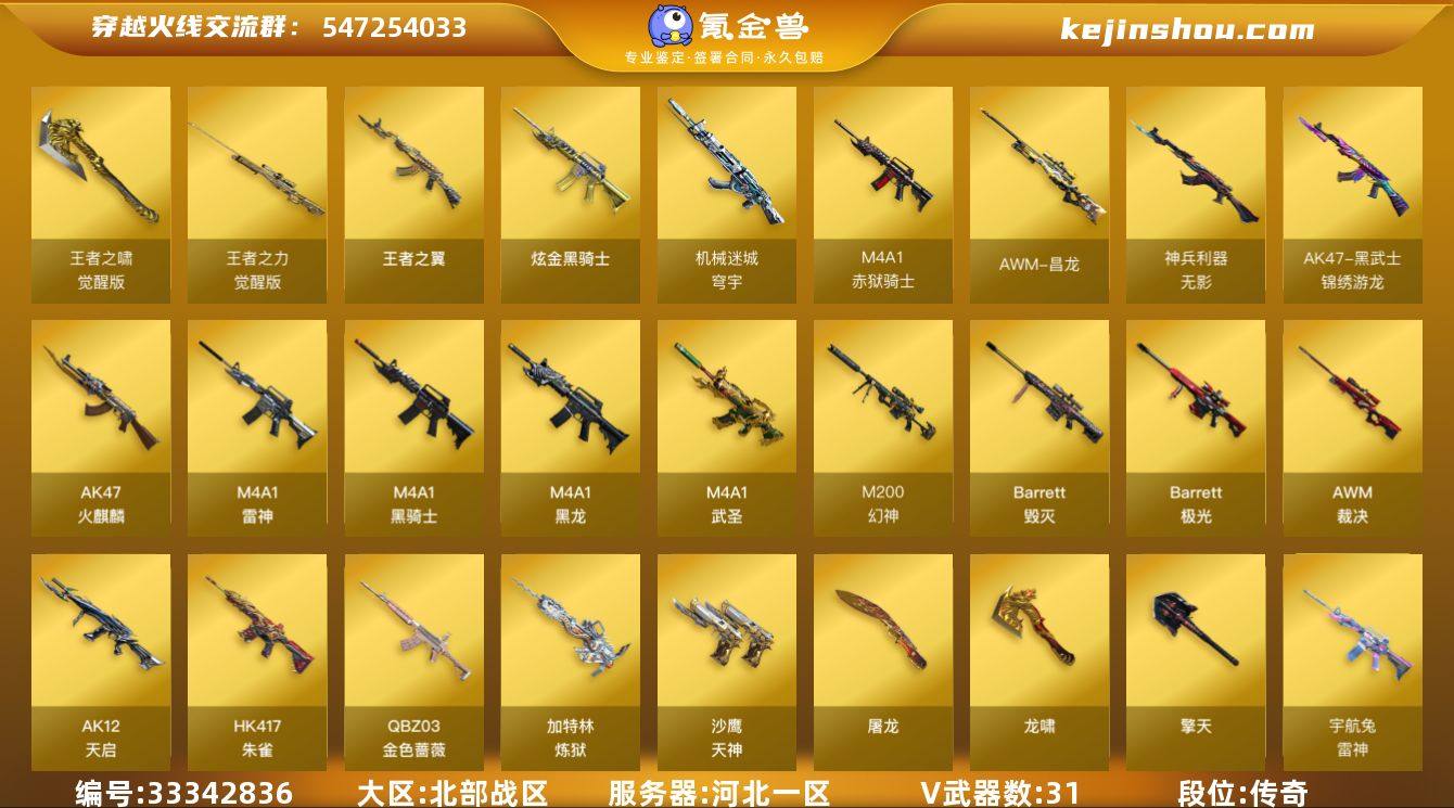 【ky6897】河北一区-38V-3王者武器数-1炫金武器数 【热门武器】:QBZ03-金色蔷薇,HK417-朱雀,M200-幻神,M4A1-黑骑士,加特林-炼狱,COP-白鲨,金刚伞 【王者炫金武器】:王者之翼,炫金骑士 【音效卡】:屠龙-电竞之星-竞星跃动音效卡,HK417-朱雀-电竞之星-竞星跃动音效卡,AWM-昌龙-怀旧音效卡*2 【皮肤】:M200-幻神-黄忠皮肤,裁决-星际旅行 皮肤,雷神-宇航兔皮肤,火麒麟-心动糖果,毁灭-黑大圣皮肤,屠龙-春桃 皮肤 【角色】:零,晴雅,战地猎狐,王者春,乔伊教练,幻面灵狐,斗烈龙骑,暗夜-X,北极狐-X,飞虎队-X,风暴女,虎妞,嘉年华灵狐,娟娟,葵-赛博朋克,0号玩家,灵狐-花神,灵狐者-X,曼陀罗-X,潘多拉-甜心教官,蛇姬,斯沃特-X,蜀雪,樱-缤纷夏日,团团 【人偶武器】:COP-白鲨,巴雷特-零-水下丽影,AWM-灵狐-15周年嘉年华,迷你深渊冰龙,迷你牛魔王,迷你波特博士,夺魂,迷你牛牛,生化手雷-机甲核心,深渊终结者手雷 【暴走生化】:超级对讲机 【挑战大师】:神圣爆裂者III,冰龙粉碎者-白马银枪,激光毁灭者III,神圣爆裂者-末日III*2,阐释者III 【英雄级武器】:AK47-火麒麟*2,M4A1-黑龙,M4A1-雷神,M4A1-黑骑士,AK12-天启,M4A1-武圣...