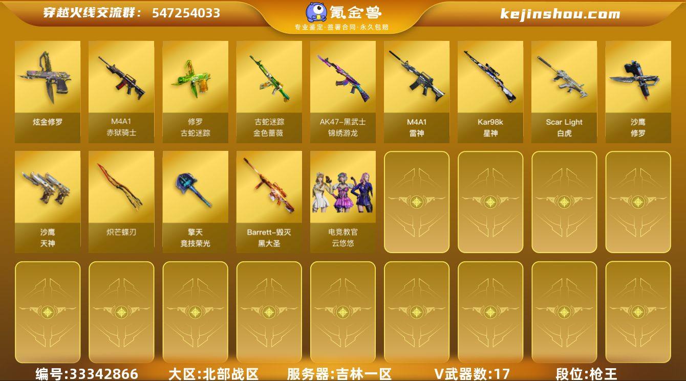 吉林一区-17V-1王者武器数-1炫金武器数 【热门武器】:Scar Light-白虎,金色蔷薇-古蛇迷踪,修罗-古蛇迷踪,Kar98K-星神,沙鹰-修罗,炽芒蝶刃 【王者炫金武器】:炫金修罗 【音效卡】:Kar98K-星神音效卡 【皮肤】:星神-美杜莎 皮肤,毁灭-黑大圣皮肤*2 【角色】:电竞教官-云悠悠,蛇隐宗,0号玩家,蛇姬,铁骑荣耀,幽 【人偶武器】:夺魂 【英雄级武器】:M4A1-雷神,Scar Light-白虎,黑武士-锦绣游龙,金色蔷薇-古蛇迷踪,Kar98K-星神,沙鹰-修罗,沙鹰-天神*3,修罗-古蛇迷踪,擎天-竞技荣光,炽芒蝶刃,高爆手雷-竞技荣光,高爆手雷-古蛇迷踪,闪光弹-竞技荣光*3,闪光弹-雷霆王者-觉醒版,烟雾弹-竞技荣光,烟雾弹-古蛇迷踪,M4A1-赤狱骑士 【道具】:古蛇迷踪炫彩背包,背包-洛丽塔,超级背包,绿色巨人,灵魂忍者,迷雾幽灵,夺命之镰,防化服*2,星辰流光-枪王排位,枪王排位28赛季金色流光,枪王排位29赛季金色流光,语音特效-机器人,语音特效-生化,古蛇迷踪打击特效,蛇隐宗表情,防弹头盔*2,防弹衣*2,C4工具钳*2,手雷包*2 【特殊枪械】:1白虎
