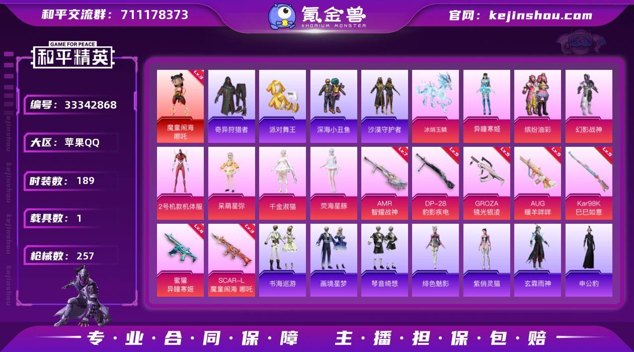 苹果 【红装号 魔童闹海-哪吒(三级)/粉装-缤纷油彩/套装-派对舞王/角色-千金淑猫/角色-2号机款机体服/SCAR-L-魔童闹海 哪吒(三级)/AUG-暖羊咩咩(五级)/冰绡玉鳞】手Q-1神装-8粉装-9特效枪-1载具-5粉色飞行器-80750热力值-17王牌印记-189套装-257枪皮 【红色神装等级】:魔童闹海-哪吒(三级) 【红色角色神装】:魔童闹海-哪吒 【热门品类】:粉装-缤纷油彩,套装-派对舞王,套装-深海小丑鱼,套装-奇异狩猎者,套装-沙漠守护者,套装-暗夜之虎,套装-龟仙人 【粉色套装】:粉装-幻影战神,粉装-缤纷油彩,角色-2号机款机体服,角色-呆萌星弥,角色-千金淑猫,角色-荧海星豚,角色-异瞳寒姬,人物-小舞·恋语 【粉色枪皮等级】:SCAR-L-魔童闹海 哪吒(三级),GROZA-镜光银凌(五级),AUG-暖羊咩咩(五级),蜜獾-异瞳寒姬(四级),UMP45-萌骑冒险(四级),Kar98K-巳巳如意(五级),Mk14-福马献瑞(五级),AMR-智耀战神(七级),DP-28-豹影疾电(五级) 【粉色载具】:冰绡玉鳞 【粉色枪皮】:SCAR-L-魔童闹海 哪吒,GROZA-镜光银凌,AUG-暖羊咩咩,蜜獾-异瞳寒姬,UMP45-萌骑冒险,Kar98K-巳巳如意,Mk14-福马献瑞,AMR-智耀战神,DP-28-豹影疾电 【粉色飞行器】:炫彩糖果飞行器,祥瑞起舞...