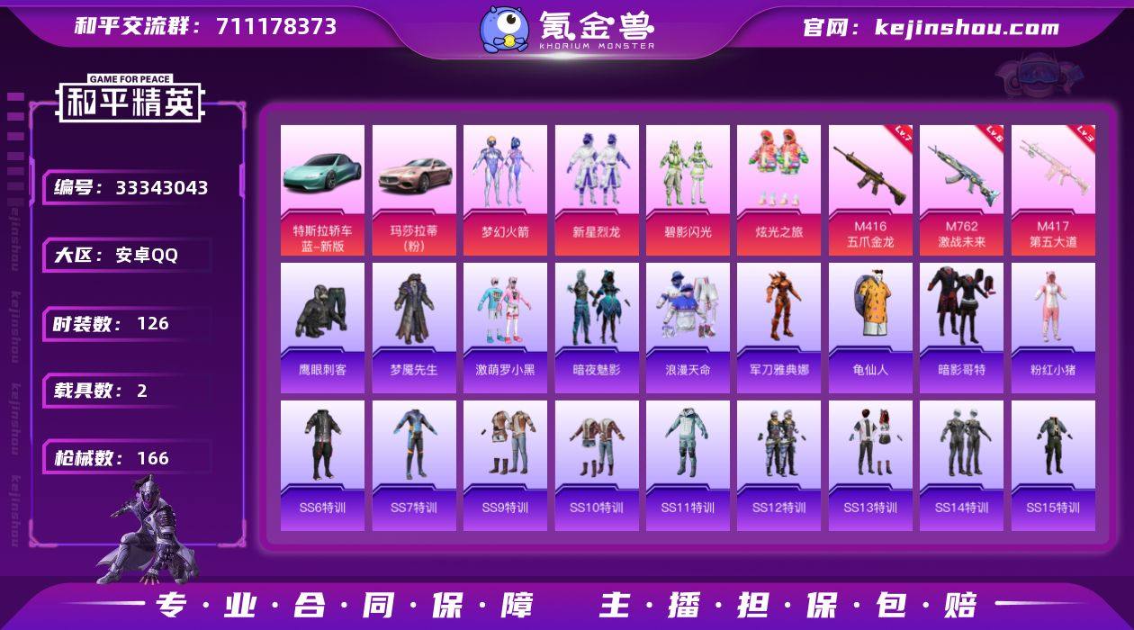 XS264386 不可二次安卓 手Q-4粉装-3特效枪-2载具-1粉色飞行器-56215热力值-11王牌印记-126套装-166枪皮 【热门品类】:粉装-梦幻火箭,套装-浪漫天命,角色-军刀雅典娜,套装-龟仙人,套装-暗影哥特,套装-粉红小猪 【粉色套装】:粉装-梦幻火箭,粉装-新星烈龙,粉装-碧影闪光,粉装-炫光之旅 【粉色枪皮等级】:M416-五爪金龙(七级),M762-激战未来(六级),M417-第五大道(三级) 【粉色载具】:特斯拉Roadster(水滴蓝),玛莎拉蒂Ghibli(粉) 【粉色枪皮】:M416-五爪金龙,M762-激战未来,M417-第五大道 【粉色飞行器】:梦幻火箭飞行器 【粉色降落伞】:至尊龙雀降落伞,PEL轰鸣竞梦者降落伞,繁花小夜曲降落伞,锦绣火鲤降落伞,机甲封神降落伞,暗夜玫瑰降落伞,恐龙拽拽降落伞,环太平洋降落伞,垂柳戏鸭降落伞,太空嘟嘟降落伞,彩虹甜喵降落伞,暗夜鎏金降落伞 【稀有套装】:套装-龟仙人 【稀有枪皮】:AKM-冰凉西瓜,AKM-夜灯,AKM-彩虹符号,AKM-灼热熔岩,AKM-环太平洋,AKM-破晓战魂,AKM-萌趣颜团子,AKM-虎虎生威,AKM-霓虹街区,AKM-龙的传人,M16A4-凝视深渊,M16A4-夜灯,M16A4-幻世战舞者,M16A4-甜心亚梦,M16A4-红色方程式,SCAR-L-暗夜玫瑰,SCAR-L-...