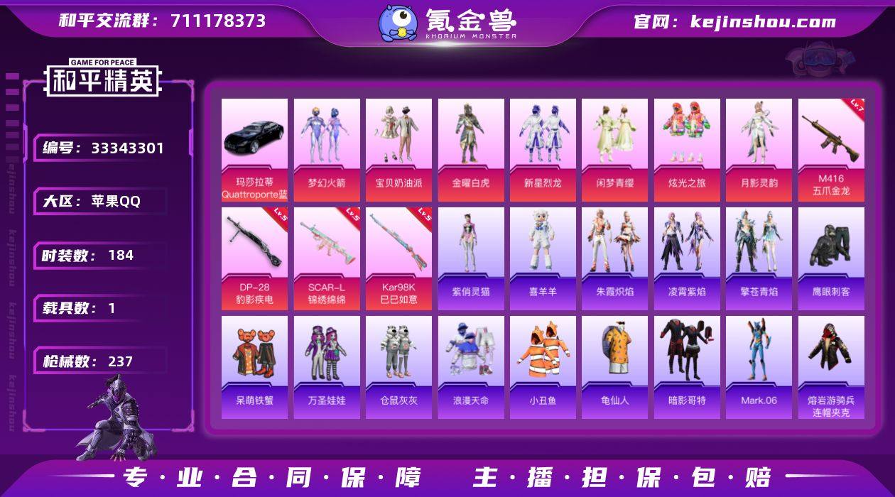 苹果【小号/13王牌印记/梦幻火箭/小丑鱼/暗影哥特/蓝螳螂/7粉装-5特效枪-1载具-4粉色飞行器】 手Q--74612热力值-13王牌印记-184套装-237枪皮 【热门品类】:粉装-梦幻火箭,套装-浪漫天命,套装-小丑鱼,套装-龟仙人,套装-暗影哥特,角色-Mark.06,熔岩游骑兵连帽夹克 【粉色套装】:粉装-宝贝奶油派,粉装-金曜白虎,粉装-梦幻火箭,粉装-新星烈龙,粉装-闲梦青缨,粉装-炫光之旅,角色-月影灵韵 【粉色枪皮等级】:SCAR-L-锦绣绵绵(五级),M416-五爪金龙(七级),Kar98K-巳巳如意(五级),Mk14-福马献瑞(五级),DP-28-豹影疾电(五级) 【粉色载具】:玛莎拉蒂Quattroporte(夜幕蓝) 【粉色枪皮】:SCAR-L-锦绣绵绵,M416-五爪金龙,Kar98K-巳巳如意,Mk14-福马献瑞,DP-28-豹影疾电 【粉色飞行器】:梦幻火箭飞行器,阿狸红飞行器,齐天大圣飞行器,镜域双华-灵镜之阶 【粉色降落伞】:甜心宝贝降落伞,至尊龙雀降落伞,梦幻火箭降落伞,垂柳戏鸭降落伞,炫光之旅降落伞,精灵梦叶罗丽降落伞,幽焰骑士降落伞,雪月幻音降落伞,绯穹魔姬降落伞,炫彩糖果降落伞 【稀有套装】:套装-龟仙人,套装-绒宝小鹅,套装-巳巳如意,套装-马上来财,套装-雏菊兔兔,套装-萝兰蝴蝶,套装...