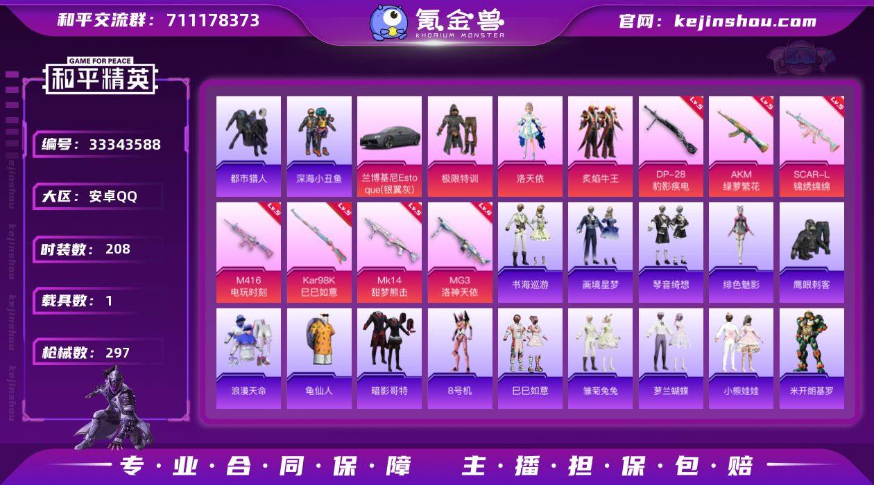 【kyhp1321】安卓 手Q-3粉装-10特效枪-1载具-1粉色飞行器-81794热力值-23王牌印记-208套装-297枪皮 【热门品类】:套装-浪漫天命,套装-都市猎人,套装-深海小丑鱼,套装-龟仙人,套装-暗影哥特,角色-8号机 【粉色套装】:粉装-极限特训,角色-洛天依,粉装-炙焰牛王 【粉色枪皮等级】:AKM-绿萝繁花(五级),SCAR-L-锦绣绵绵(五级),M416-电玩时刻(五级),ACE32-萌骑漫游(五级),AKS-74U-森灵之息(五级),Kar98K-巳巳如意(五级),Mk14-甜梦熊击(五级),Mk14-福马献瑞(五级),DP-28-豹影疾电(五级),MG3-洛神天依(四级) 【粉色载具】:兰博基尼Estoque(银翼灰) 【粉色枪皮】:AKM-绿萝繁花,SCAR-L-锦绣绵绵,M416-电玩时刻,ACE32-萌骑漫游,AKS-74U-森灵之息,Kar98K-巳巳如意,Mk14-甜梦熊击,Mk14-福马献瑞,DP-28-豹影疾电,MG3-洛神天依 【粉色飞行器】:炫彩糖果飞行器 【粉色降落伞】:极限特训降落伞,洛神天依降落伞,黄族统领降落伞,炫彩糖果降落伞 【稀有套装】:套装-龟仙人,套装-巳巳如意,套装-雪国风尚,套装-炫彩糖果,角色-罗莉,套装-马上有钱,套装-雏菊兔兔,套装-萝兰蝴蝶,套装-小熊娃娃,角色-米开朗基罗,套装-糖糖葫芦,套装-青团波波,套装-燕...