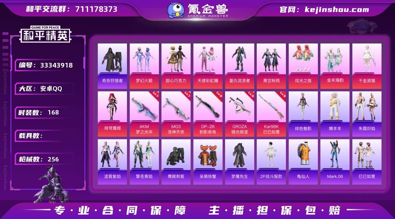 安卓【小号/15王牌印记/甜心巧克力/梦幻火箭/蓝螳螂/10粉装-7特效枪-1粉色飞行器】 手Q--80024热力值-15王牌印记-168套装-256枪皮 【热门品类】:粉装-梦幻火箭,套装-奇异狩猎者,角色-2P战斗服款,套装-龟仙人,角色-Mark.06 【粉色套装】:粉装-甜心巧克力,粉装-天使彩虹糖,粉装-梦幻火箭,角色-复仇流浪者,粉装-青空秋雨,粉装-炫光之旅,粉装-金丰海韵,角色-千金淑猫,角色-绯穹魔姬,角色-罪夜之冕 【粉色枪皮等级】:AKM-梦之光华(七级),GROZA-镜光银凌(五级),Kar98K-巳巳如意(五级),Mk14-福马献瑞(五级),AA12-G-萌骑幻想(五级),DP-28-豹影疾电(五级),MG3-洛神天依(七级) 【粉色枪皮】:AKM-梦之光华,GROZA-镜光银凌,Kar98K-巳巳如意,Mk14-福马献瑞,AA12-G-萌骑幻想,DP-28-豹影疾电,MG3-洛神天依 【粉色飞行器】:炫彩糖果飞行器 【粉色降落伞】:至尊龙雀降落伞,梦幻火箭降落伞,洛神天依降落伞,环太平洋降落伞,垂柳戏鸭降落伞,彩虹甜喵降落伞,旋转彩虹降落伞,音爆索尼克降落伞,仲夏莫吉托降落伞,飒粉甜心降落伞,未来歌姬降落伞,萌物绒绒降落伞,精灵梦叶罗丽降落伞,创世·救赎降落伞,忍者神龟降落伞,彩虹独角兽降落伞,月下星之子降落伞...