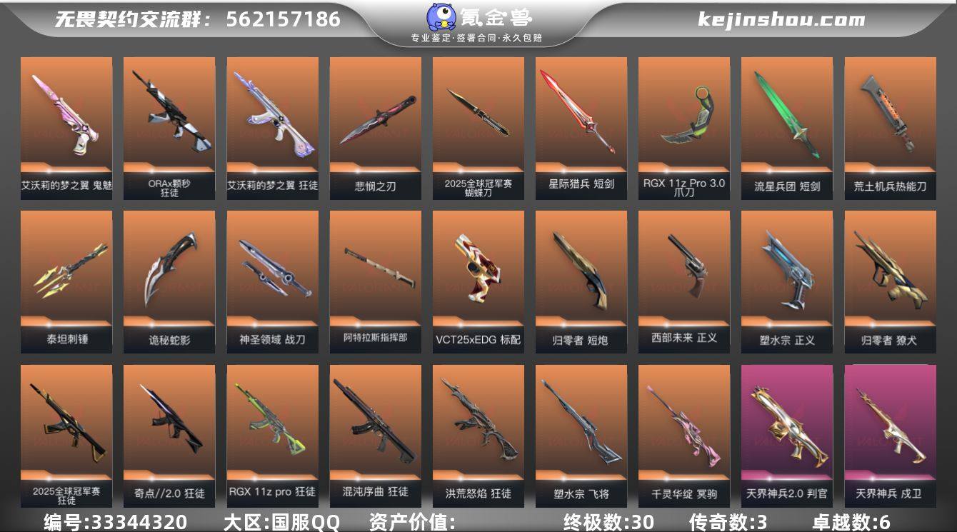 【套装】:2025全球冠军赛套装,无畏契约季前邀请赛套装 【英雄】:幻棱,炼狱,维斯,暮蝶,钛狐,壹决,铁臂,捷风,雷兹,幽影,不死鸟,贤者,猎枭,蝰蛇,零,芮娜,奇乐,尚勃勒,霓虹,斯凯,夜露,星礈,K/O,海神,盖可,黑梦,钢锁 【近战武器】:近战武器-2025全球冠军赛 蝴蝶刀,近战武器-碎心裂刃,近战武器-无畏契约季前邀请赛 悲悯之刃,近战武器-嘟昂嘟昂超弹力水球拳套,近战武器-神之刃,近战武器-穿花蝴蝶,近战武器-RGX 11z Pro//3.0 爪刀,近战武器-黑波之刃,近战武器-镭切,近战武器-鬼丸国纲,近战武器-流星兵团 短剑,近战武器-荒土机兵 热能刀,近战武器-泰坦刺锤,近战武器-影刃,近战武器-诡秘蛇影 军刀,近战武器-神圣领域 战刀,近战武器-阿特拉斯指挥部 甩棍,近战武器-星际猎兵 短剑 【狂徒】:狂徒-2025全球冠军赛,狂徒-洪荒怒焰,狂徒-混沌序曲,狂徒-奇点//2.0,狂徒-RGX 11z Pro,狂徒-ORA x 颗秒,狂徒-艾沃莉的梦之翼,狂徒-盖亚的复仇,狂徒-日冕雄师,狂徒-荒土机兵,狂徒-流星兵团,狂徒-诡秘蛇影 【幻影】:幻影-天界神兵//2.0,幻影-侦察力量,幻影-神圣领域,幻影-纳米打击,幻影-末日之翼 【戍卫】:戍卫-天界神兵,戍卫-逆冲...