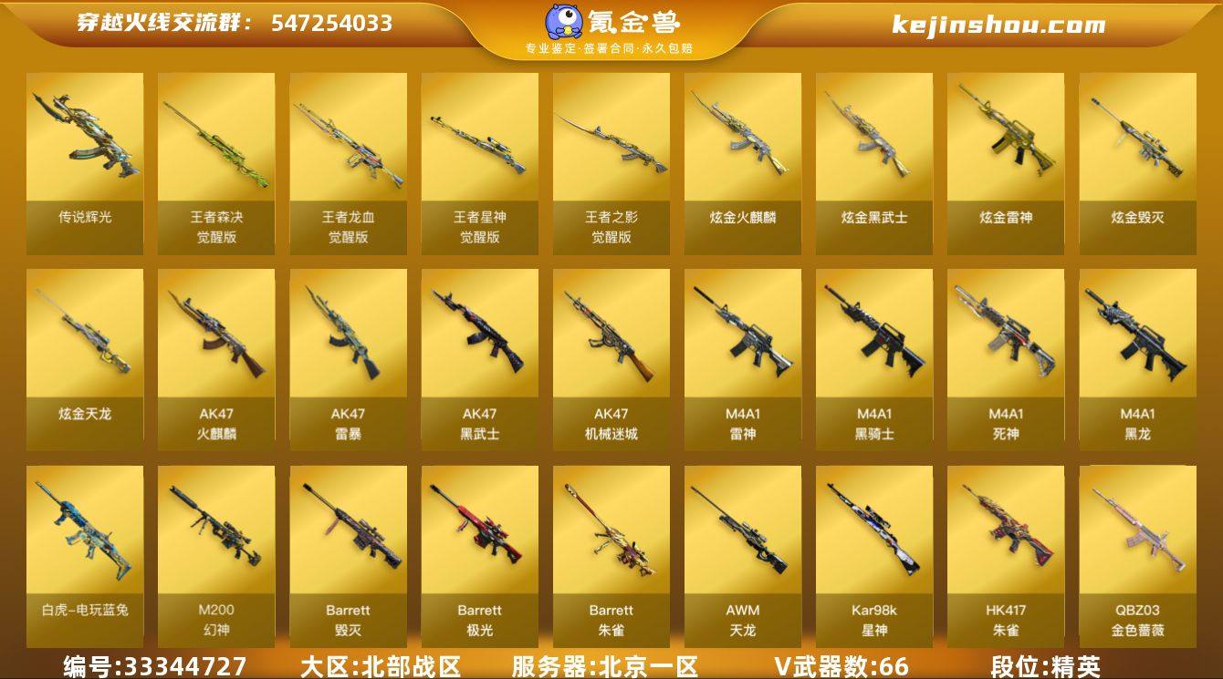 北京一区-72V-4王者武器数-6炫金武器数 【传说武器】:传说辉光 【热门武器】:传说辉光,QBZ03-金色蔷薇,Scar Light-白虎,HK417-朱雀,M200-幻神,M200-竞技荣光,死亡之眼,白虎-电玩蓝兔,Kar98K-星神,C.A.T,牛牛-AK47,M4A1-黑骑士,汤姆逊-烈龙*6,RPK-盘龙*4,加特林-炼狱*2,斯泰尔-蝴蝶,裁决-雪莉杨,沙鹰-修罗*2 【王者炫金武器】:炫金火麒麟,炫金雷神,炫金武士*2,炫金毁灭,炫金天龙 【音效卡】:M4A1-黑龙音效卡,M4A1-黑骑士音效卡,Barrett-毁灭音效卡,QBZ03-金色蔷薇音效卡,70KG语音包 【皮肤】:幻神-AG-CFPLS17冠军,白虎-电玩粉兔皮肤,雷神-能量核心,火麒麟-轻羽皮肤,传奇石头-横秒之巅,火麒麟-盘古,毁灭耀金皮肤,毁灭-SV-CFPLS16冠军,M4A1-千变-孔明皮肤,黑龙-暗月*2,黑骑士-电玩青兔皮肤,死神-秘银,战神-紫绶金章皮肤*2,AK47-B-常胜将军-刘备*3,天龙-秘银,天龙-能量核心,AWM-天龙-传奇白鲨,极光-能量核心,修罗-能量核心,修罗耀金皮肤*2 【角色】:葵,樱,王者之瞳,风暴女,嘉年华灵狐,灵动武士,灵狐者-职业经理,潘多拉-X,潜龙队-X,蜀雪,铁骑荣耀,兔囡囡,影武者-X,职业选手,海豹突击队 【人偶武器】:裁决-雪莉杨...