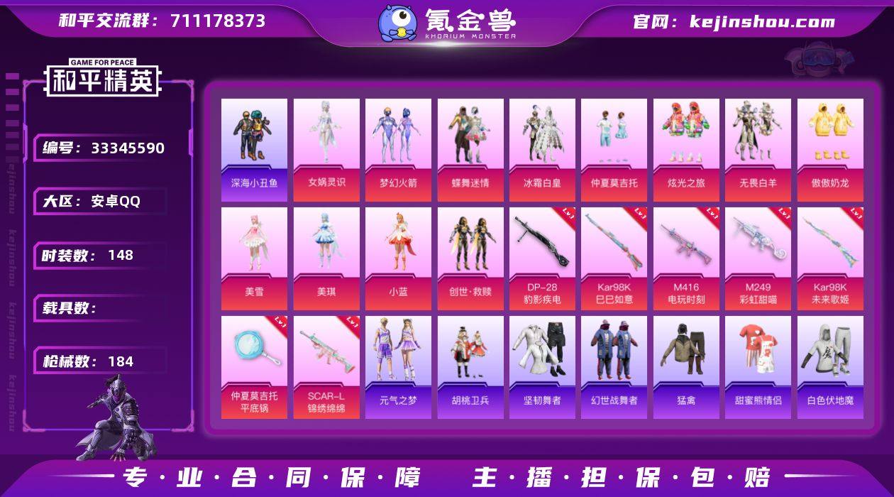可二次实名【女号梦幻火箭12粉装7特效枪 秒换绑不用等】 安卓Q区-72430热力值-8印记-148套装-184枪皮 【12粉装】 梦幻火箭 冰霜白皇 蝶舞迷情 炫光之旅 傲傲奶龙 仲夏莫吉托 创世·救赎 无畏白羊 角色-小蓝 角色-美雪 角色-美琪 角色-女娲灵识【7特效枪】 SCAR-L-锦绣绵绵(5级) Kar98K-未来歌姬(4级) M249-彩虹甜喵(6级) 平底锅-仲夏莫吉托(1级) Kar98K-巳巳如意(5级) M416-电玩时刻(5级) DP-28-豹影疾电(2级)【131热门】 雪山精英(老6服) 破蛋小黄鸡 小丑鱼 深海小丑鱼 暗影哥特(红眼罩) 白色伏地魔 SS9特训 SS8特训 SS6特训 SS27特训 SS26特训 SS25特训 SS24特训 SS23特训 SS22特训 GROZA-乌木金纹 SCAR-L-玉兔迎春 GROZA-田园牧歌 M762-天降萌叽 Mk47-乌木金纹 SKS-糯团青竹 UZI-娇憨猪猪 UMP45-蓝色火焰 S12K-垂柳戏鸭 M249-彩虹符号 MG3-幻世战舞者 AKM-霓虹街区 AKM-春暖花开 M416-蓝色火焰 GROZA-异彩先驱 GROZA-春暖花开 M762-第五大道 长空猛禽 异彩先驱 甜蜜熊情侣 青涩时光 青年教官 骑行爱好者 暖心熊熊 牛气冲天 霓虹街区 霓虹极客 妙红点点 梦幻奶油 懵萌河马 魅力单车 蓝色运动 酷萌兔限定 竞技勇士朋克 竞技达人朋克 坚韧舞者 黄色伏地魔 黑色伏地魔 和煦暖阳...