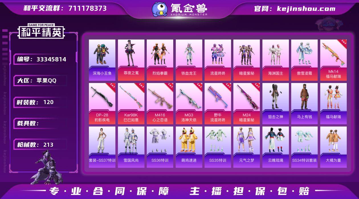 可二次实名【满级M4心之恋语7粉装7特效枪 秒换绑不用等】 苹果Q区-67639热力值-15印记-120套装-213枪皮 【7粉装】 傲雪凌霜 流星咚咚 罪夜之冕 烈焰拳霸 铁血龙王 海渊国主 暗星紫秘【7特效枪】 M416-心之恋语(7级) Mk14-福马献瑞(5级) 野牛-流星咚咚(7级) M24-暗星紫秘(4级) MG3-洛神天依(7级) Kar98K-巳巳如意(5级) DP-28-豹影疾电(5级)【151热门】 破蛋小黄鸡 深海小丑鱼 大橘为重 团圆交子 瑞龙福将 狂沙舞者 SS9特训 SS22特训 SS10特训 Mk47-洛神天依 Mk14-暗星紫秘 Kar98K-电玩视界 AWM-不夜海上花 SCAR-L-玉兔迎春 M762-天降萌叽 Mk47-乌木金纹 UZI-娇憨猪猪 M416-夜灯 UMP45-蓝色火焰 MG3-幻世战舞者 AKM-虎虎生威 AKM-霓虹街区 AKM-春暖花开 M416-神秘黑猫 M416-葫芦兄弟 M416-蓝色火焰 青龙圣者 GROZA-异彩先驱 GROZA-蓝莓炮弹 GROZA-春暖花开 M762-镭射皇者 众神之王 长空猛禽 异彩先驱 虚音幻奏 甜心亚梦 霓虹极客 灰色格斗者 淡雅花蕊 白月香洋装 风华少年志 M762-瑞龙福将 S1897-糯团青竹 MK47-林间仙鹿 M24-香水柠檬 顶瓜瓜 雏菊兔兔 MG-36-薄荷星砂 GROZA-福马献瑞 恋语绒绒 SS34特训 星渊小夜曲 AWM-天降萌叽 SS11特训 SS12特训 福马献瑞 大橘大利 SS13特训...