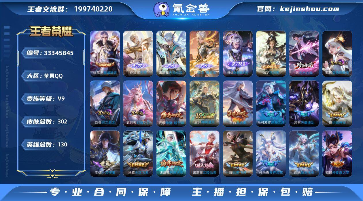 【V9,302皮,2水4无双2珍品21传说3星传说,孙悟空曜诸葛韩信无双,伽罗新珍品,凤求凰,妲己抹茶,都是精品皮,1天幕,12套按键】贵族9 荣耀典藏2 无双4 珍品传说2 星传说3 传说皮肤21 史诗皮肤80 皮肤数量302 皮肤价值:213496 英雄130 荣耀王者 总场次13037