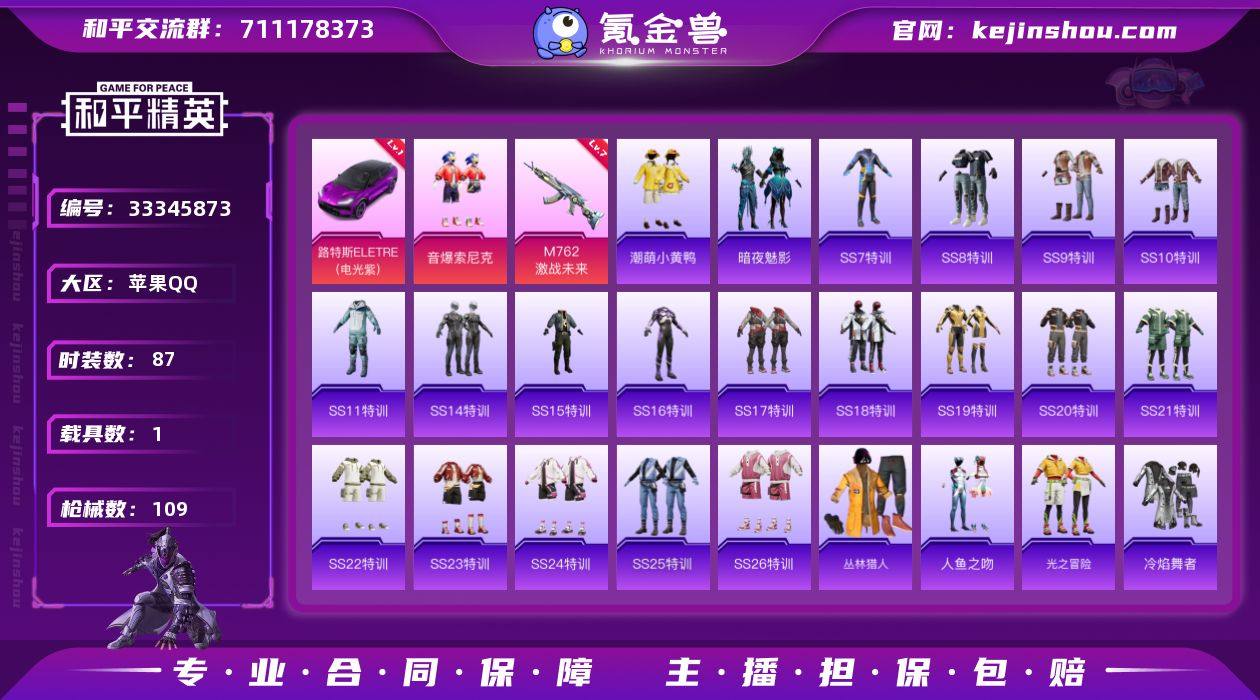 苹果手Q S-KWF432【1粉装1特效枪1载具 一级电光紫路特斯 音爆索尼克/潮萌小黄鸭/冰川特警/雪山精英】35637热力值9王牌印记87套装109枪皮 【红色载具】:路特斯ELETRE(电光紫)(一级) 【热门品类】:粉装-音爆索尼克,套装-潮萌小黄鸭 【粉色套装】:粉装-音爆索尼克 【粉色枪皮等级】:M762-激战未来(七级) 【粉色载具】:路特斯ELETRE(电光紫) 【粉色枪皮】:M762-激战未来 【粉色降落伞】:炫紫旋律降落伞 【稀有枪皮】:AKM-夜灯,AKM-奇异狩猎者,AKM-生命誓