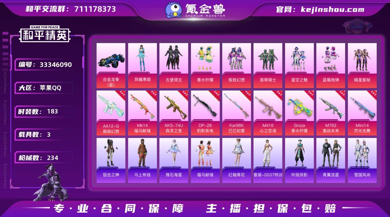 【满级M4心之恋语8粉装9特效枪3载具 秒换绑不用等】 苹果Q区-85165热力值-183套装-234枪皮 【3载具】 阿斯顿马丁X蓝色 特斯拉R水滴蓝 合金龙骨蓝色【1稀有】 奇异狩猎者【8粉装】 极致幻想 星空之魅 香水柠檬 蓝莓炮弹 暗星紫秘 古堡领主 翡翠骑士 角色-异瞳寒姬【9特效枪】 M416-心之恋语(7级) AKS-74U-森灵之息(5级) Mk14-福马献瑞(5级) AA12-G-萌骑幻想(2级) Mini14-荧光虫舞(5级) GROZA-香水柠檬(7级) M762-激战未来(7级) Kar98K-巳巳如意(5级) DP-28-豹影疾电(5级)【189热门】 雪山精英(老6服) 机械英豪 破蛋小黄鸡 迅捷狂鲨 暗夜契约 醒狮腾龙 团圆交子 瑞龙福将 纯白誓言 SS9特训 SS8特训 SS6特训 SS3特训 SS2特训 SS27特训 PEL摇滚竞梦者 M762-乌木金纹 M762-橘柚倾心 AKM-缤纷海域 M416-乌木金纹 GROZA-乌木金纹 GROZA-恐龙拽拽 M762-天降萌叽 M416-夜灯 UMP45-蓝色火焰 MG3-幻世战舞者 AKM-虎虎生威 AKM-霓虹街区 AKM-春暖花开 M16A4-魔法学院 SCAR-L-扶摇飞仙 M416-神秘黑猫 M416-蓝色火焰 青龙圣者 GROZA-异彩先驱 GROZA-春暖花开 GROZA-彩虹符号 M762-镭射皇者 长空猛禽 弄潮海豚 迎春赐吉 异彩先驱 甜蜜熊情侣 特训学院 童话森林 燃烧卡路里 拳皇97八神庵 青涩...