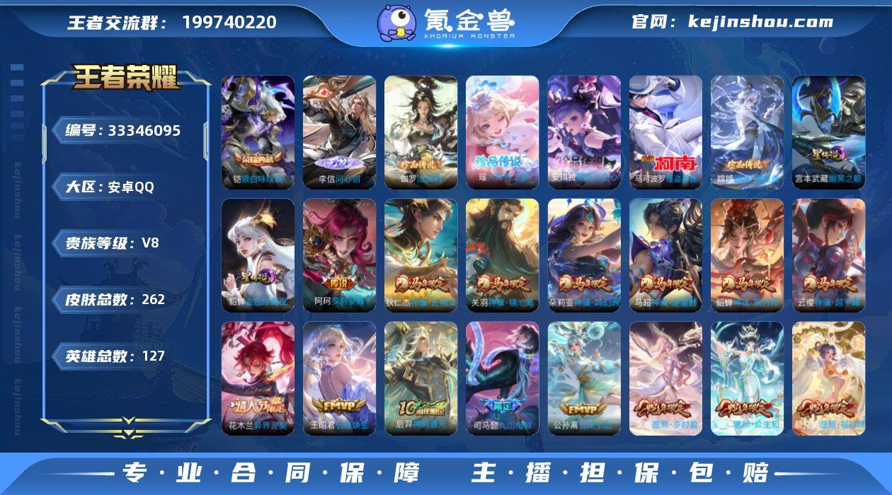 "安卓QQ区,V8账号(即将V9)。皮肤261款,含典藏铠银白咏叹调、星传幽冥之眼/金色仲夏夜,29款传说。 账号不可改实名,个人退游号,承诺绝不找回支持验号,走平台寄售