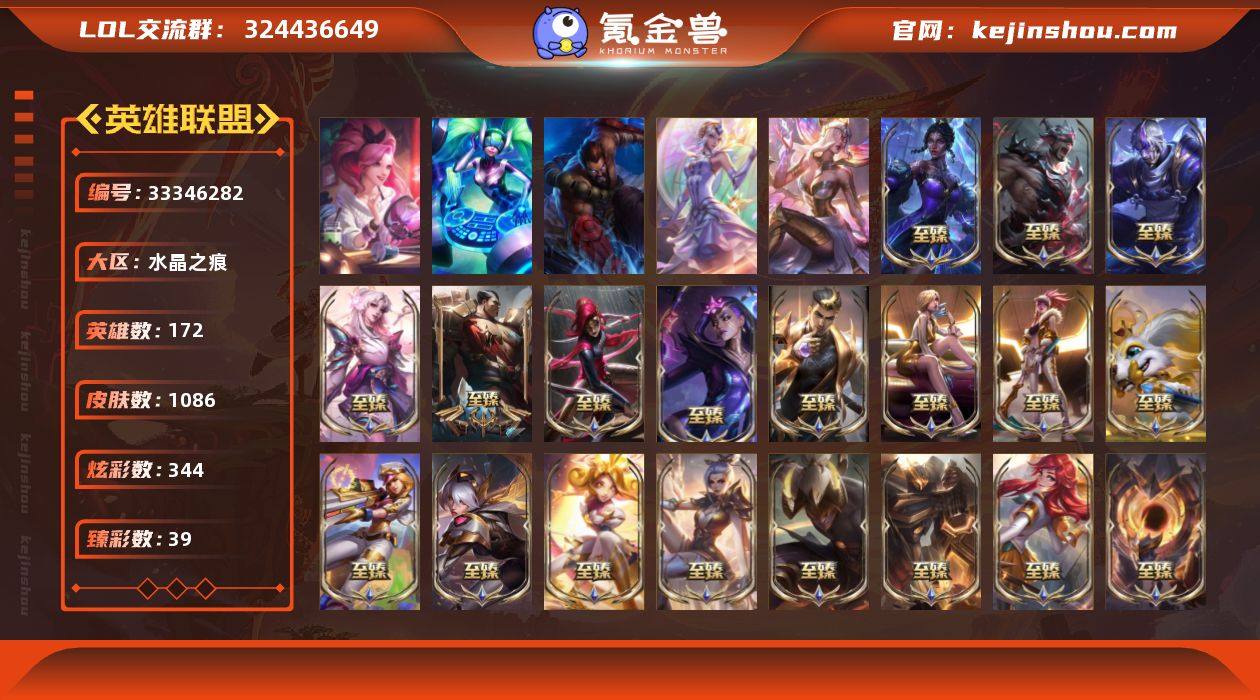 t39665【水晶之痕】1086皮肤 344炫彩 39臻彩 69神话/166限定/89传说/172英雄 账号等级:770 【重要头像】爱情之歌 两仪无极 萨勒芬妮超级巨星 萨勒芬妮独立音乐人 春晖神女拉克丝 KDA萨勒芬妮 小斗 幼犬内瑟斯 幼犬沃里克 沐浴震惊 烈焰美人薇恩 披萨鸡 此志无双羽饰骑士 不错哦 征服者韦鲁斯炫金 至臻星之守护者辛德拉 至臻魅惑女巫莫甘娜 至臻女帝黛安娜 至臻KDA卡莎 至臻灵魂莲华提莫 【重要皮肤】北极星神梅尔至臻 机神玄武盖伦至臻 T1塞拉斯至臻 灵魂莲华劫至臻 灵魂莲华拉克丝至臻 凯旋将军德莱厄斯至臻 黑色玫瑰假面舞会卡特琳娜至臻 暗星女王黛安娜至臻 T1杰斯至臻 青花瓷千珏至臻 天龙之子伊泽瑞尔至臻 斗魂觉醒萨科至臻 绝息圣堂厄运小姐至臻 青花瓷丽桑卓至臻 至高天奎桑提至臻 星之守护者辛德拉至臻 西部魔影猎天使恶魔泰隆至臻 魅惑女巫莫甘娜至臻 女帝黛安娜至臻 未来战士卢锡安至臻 真实伤害亚索至臻 灵魂莲华提莫至臻 灵能特工伊泽瑞尔至臻 源计划逆流塞拉斯至臻 暗星墨菲特至臻 神龙尊者炎龙瑟提至臻 黑夜使者凯隐至臻 神龙尊者均衡之龙沃利贝尔至臻 KDA二代卡莎至臻 KDA伊芙琳至臻 KDA阿卡丽至臻 KDA阿...