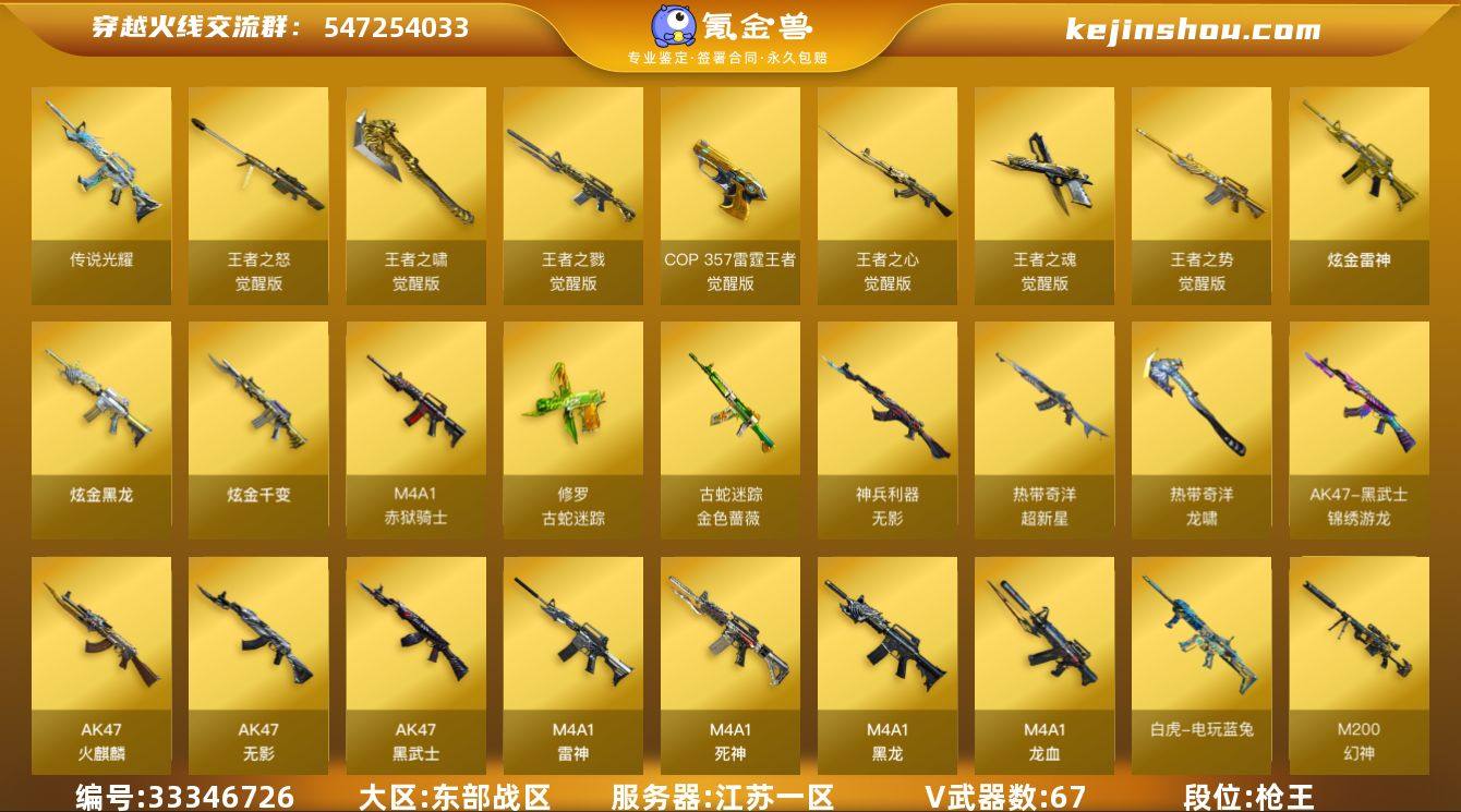 江苏一区-79V-11王者武器数-3炫金武器数 【传说武器】:传说光耀(序列号版),传说光耀 【热门武器】:传说光耀,QBZ03-金色蔷薇,Scar Light-白虎,M200-幻神,金色蔷薇-古蛇迷踪,修罗-古蛇迷踪,荣耀世冠-雷神,白虎-电玩蓝兔,荣耀世冠-柯尔特,Kar98K-星神,金色小号,炼狱-迷你小钢,牛牛-AK47,汤姆逊-烈龙*6,RPK-盘龙*2,斯泰尔-蝴蝶,沙鹰-修罗*3,金刚伞 【王者炫金武器】:炫金黑龙,炫金千变,炫金雷神 【音效卡】:M200-幻神音效卡,AK47-火麒麟音效卡,M4A1-雷神音效卡,M4A1-黑龙音效卡,Barrett-毁灭音效卡 【皮肤】:幻神-周瑜皮肤,幻神-电竞之星 皮肤,雷神-荣耀之魄,雷神-星空,雷神-虎将,雷神-冠军之魄,雷神-荣耀世冠AG,火麒麟-轻羽皮肤,火麒麟-荣耀世冠AG,毁灭-暗月,毁灭-荣耀之怒,毁灭耀金皮肤,毁灭-星空,M4A1-千变-孔明皮肤,黑龙-能量核心,战神-粉色甜心皮肤,战神-紫绶金章皮肤,战神-流金岁月皮肤,AK47-B-常胜将军-刘备*5,AK47-B-常胜将军-孙权*3,天龙-能量核心,AWM-天龙-传奇70KG,修罗-能量核心,屠龙-荣耀之锋,屠龙-荣耀世冠AG 【角色】:零,葵,樱,王者春,王者涂鸦,蛇隐宗,奇洋探员,乔伊教练,幻面灵狐,初恋灵狐,芳...