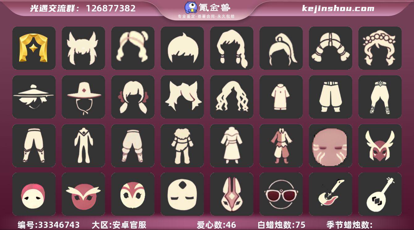编号AY490 安卓手机 换绑CD:5.9 详情请看衣柜截图 蜡烛数:75 爱心数:46 季节已毕业:表演季 珍稀物品:无 完成地图:霞谷 暮土 裤子:透明裤子 毛靴裤 灯笼裤 紧身裤 连体裤 武士裤 雪人裤 猫猫裤 小丑裤 鞋子:布鞋 面具:矮人面具 兔头 黄眉企鹅面具 小企鹅面具 黑脸白眉面具 忧郁脸面具 白色条纹面具 面饰:蔚蓝眼镜 发型:公主 粗辫 书虫 正太 高马尾 明制 若笠 花环 白枭 樱花 猫耳 女巫 头饰:蝴蝶发饰 羽毛装饰 珊瑚 皇冠 蓝色音乐会 红耳机 斗篷:花瓣斗篷 荧蓝斗篷 红金 黑金 白鸟斗 黄色蓑衣 海洋斗 彩虹斗 万圣斗 圣诞斗 配饰:笛子 吉他 三味线 高音钢琴 贝斯乐器 雨伞 万圣椅 气球 当前身高 2.5524176115818378 预计最高可达 1.923490515693651 预计最矮可到 13.92349051569365