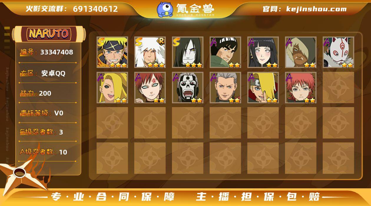【HYX3732】VIP等级V0/战力200W/S忍数量3/A忍数量10/三星S-自来也「舞之豪杰」/二星A-达鲁伊「五代目雷影」/二星A-飞段「死司凭血」/二星A-迪达拉「秽土转生」/二星A-蝎/二星A-日向雏田 「最终章」/二星A-飞段/三星S-漩涡鸣人·宇智波佐助/二星A-我爱罗「忍界大战」/二星A-迪达拉/三星S-大蛇丸/二星A-迈特凯「青春爆炸」/二星A-神秘面具男 「忍者之路」