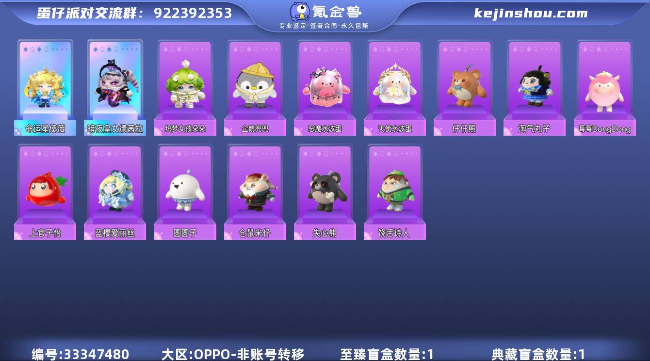 2至臻1羊56紫,命运星使薇,暗夜皇女德茜拉,莓莓羊,企鹅兜兜 【XTD440】 ✅区服:oppo✅登陆方式:手机号 ✅历史潮流:98160✅氪条:27530 ✅至臻数量:2✅ 紫色套装数量:56 ✅至臻套装:命运星使薇,暗夜皇女德茜拉 ✅紫色套装:莓莓dongdong,淘气丸子,圆圆子,仔仔熊,蓝樱爱丽丝,失心熊,仓鼠米仔,嗷嗷,饶舌诗人,恶魔水波蛋,天使水波蛋,企鹅兜兜,上官子怡,沉梦女孩朵朵 ✅载具:无 ✅背饰:鱼龙光舞,魔术旋旋杖,命轮星盘,路易斯西洋棋,垂耳兔背包,孤岛之鲸 ✅热门动作:双人牵手