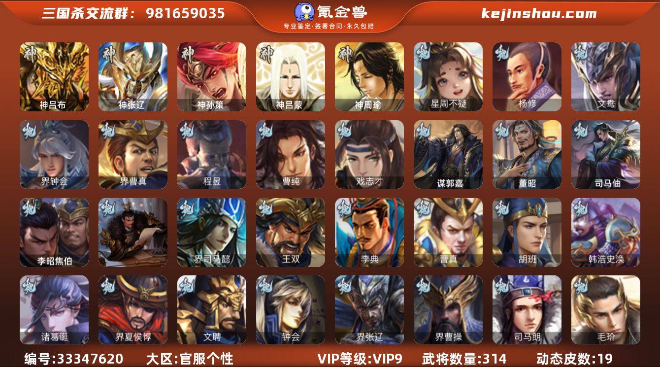 【JYSGS94】官阶:骠骑将军;VIP等级:VIP9;史诗武将数量:34;动态皮肤数量:19;武将总数:314;史诗宝珠数量:0;将魂数量:218;神将:3;魏国史诗武将:12;蜀国史诗武将:6;吴国史诗武将:5;群史诗武将:15 神吕布,神张辽,神孙策,星周不疑,杨修,界钟会,界曹真,曹纯,戏志才,程昱,关索,谋赵云,赵襄,王平,沙摩柯,花鬘,界朱然,界徐盛,贺齐,文鸯,十常侍,谋貂蝉,左慈,张让,杨彪,陶谦,南华老仙,沮授,界李儒,谋张角,许攸,星董卓,兀突骨,司马昭,神吕蒙,神周瑜,SP关羽,乐进,曹昂,诸葛诞,朱灵,文聘,SP姜维,钟会,曹冲,郭淮,满宠,界王异,界曹操,界司马懿,界夏侯惇,界张辽,李典,曹真,韩浩史涣,陈群,曹叡,钟繇,司马朗,辛宪英,界甄姬,吕虔,鲁芝,界典韦,界荀彧,杜畿,界曹丕,界曹植,界满宠,界郭淮,卞夫人,华歆,蔡贞姬,袁涣,王双,崔琰,毛玠,阮慧,谋徐晃,谋荀彧,界曹休,牵招,胡班,李昭焦伯,司马伷,谋郭嘉,董昭,SP孙尚香,关银屏,夏侯霸,马良,关兴张苞,廖化,界马岱,关平,简雍,刘封,界法正,界关兴张苞,界刘备,界关羽,界赵云,界马超,SP徐庶,吴懿,周仓,张松,刘谌,夏侯氏,黄皓,界诸葛亮,严颜,界伊籍,界卧龙诸葛,界庞统,吕凯,张翼,杨仪,费祎,界周仓,宗预,刘巴,彭羕,谋庞统,谋黄月英,界张嶷,谋姜维,谋孟获,谋...