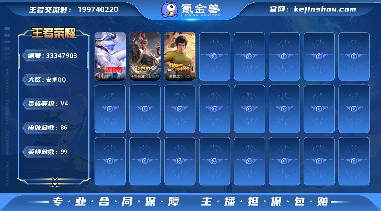 安卓Q 可二次 1珍品传说1传说99英雄86皮肤 怪盗基德 久胜战神 万灵启世 逐霄之志 天秀启明 原初探秘者 李小龙 水晶猎龙者 暗隐猎兽者 金属风暴 特工魅影 黄金分割率 逐浪之夏 魅语 紫霞仙子 圣诞恋歌 幽灵船长 乘风破浪 节奏热浪 时之恋人女 街头霸王 月团寄思 鬼剑武藏 朔风刀 混沌棋 疑决卦 万华元夜 拳王 霸王丸 擒涛扼浪 魅力维加斯 水果甜心 古海寻踪 天穹祈灯 鹰眼统帅 王者荣耀账号
