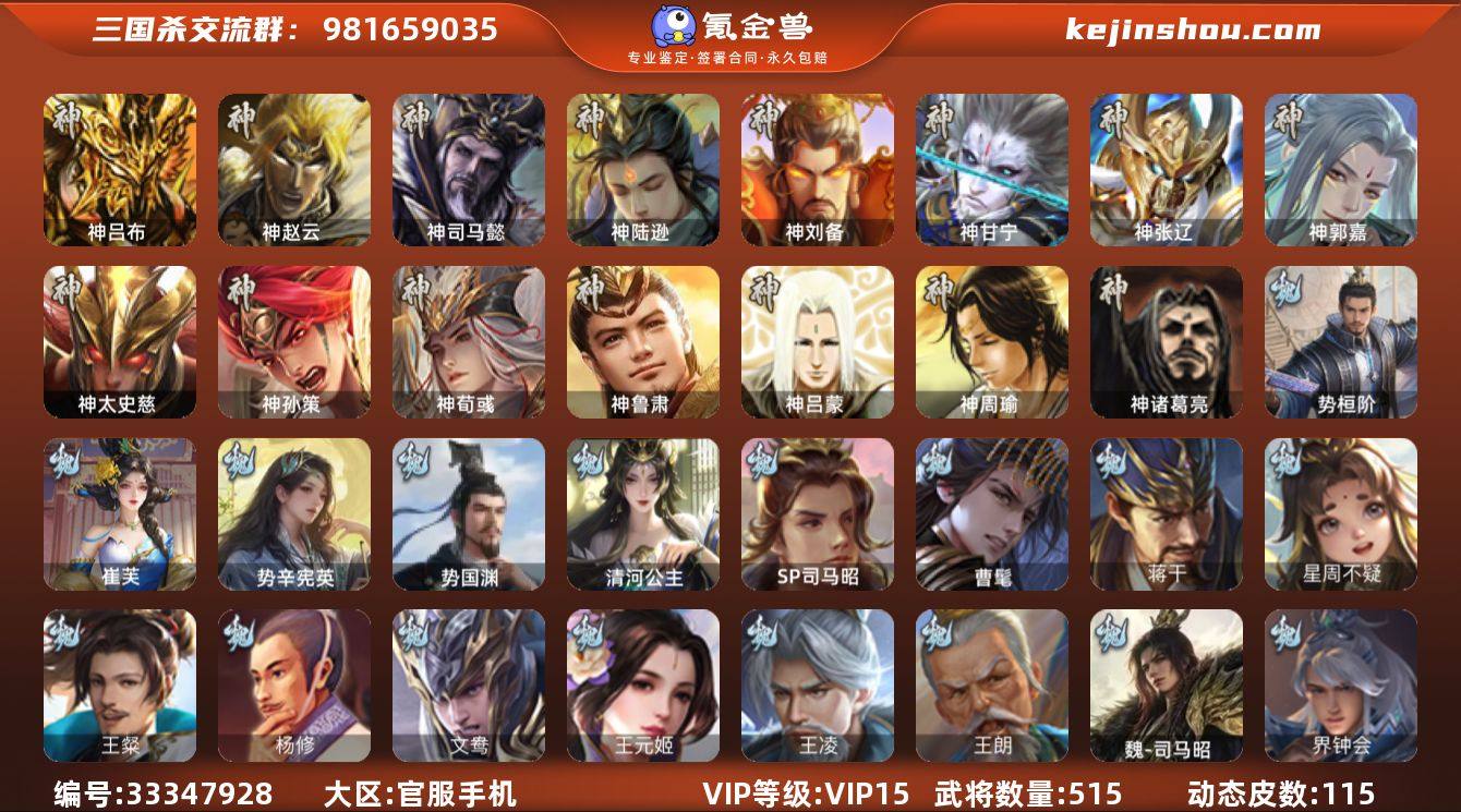 VIP等级: VIP15 官阶: 大将军 武将数量: 515 动态皮肤数量: 115 神将: 神甘宁,神郭嘉,神刘备,神陆逊,神吕布,神司马懿,神孙策,神太史慈,神荀彧,神张辽,神赵云,神吕蒙,神周瑜,神诸葛亮,神鲁肃 魏国武将: 刘晔,戏志才,曹纯,曹婴,陈琳,程昱,郝昭,嵇康,界曹真,界于禁,界钟会,魏-司马昭,王朗,王凌,王元姬,文鸯,杨修,王粲,唐咨-魏,徐庶,张辽,SP蔡文姬,SP曹仁,SP关羽,SP贾诩,SP姜维,SP庞德,卞夫人,蔡贞姬,曹昂,曹操,曹冲,曹洪,曹丕,曹仁,曹叡,曹嵩,王异,张恭,鲁芝,界满宠,曹休,界曹植,满宠,荀攸,王基,钟繇,蒯越蒯良,郭嘉,牵招,荀彧,杜畿,界郭嘉,崔琰,界曹丕,界荀彧,朱灵,界甄姬,辛毗,吕虔,界王异,界许褚,界郭淮,华歆,陈群,界邓艾,界典韦,界曹休,司马孚,袁涣,李通,乐进,辛宪英,郭淮,毛玠,界曹彰,郭皇后,毌丘俭,夏侯惇,曹植,司马朗,谋于禁,界曹操,星周不疑,许褚,界张辽,谋徐晃,蒋干,张郃,钟会,文聘,曹彰,界夏侯惇,诸葛诞,司马懿,甄姬,界徐晃,徐晃,界曹仁,孙资刘放,韩浩史涣,胡班,曹真,典韦,界夏侯渊,谋荀彧,夏侯渊,李典,于禁,王双,邓艾,界司马懿,张春华,孟达-魏,臧霸,牛金,朱灵(国战),文钦-魏,曹髦,成济,玄·毌丘俭,李昭焦伯,清河公主,SP司马昭,司马伷,董昭,谋郭嘉,谋张辽,谋夏侯渊,势国...