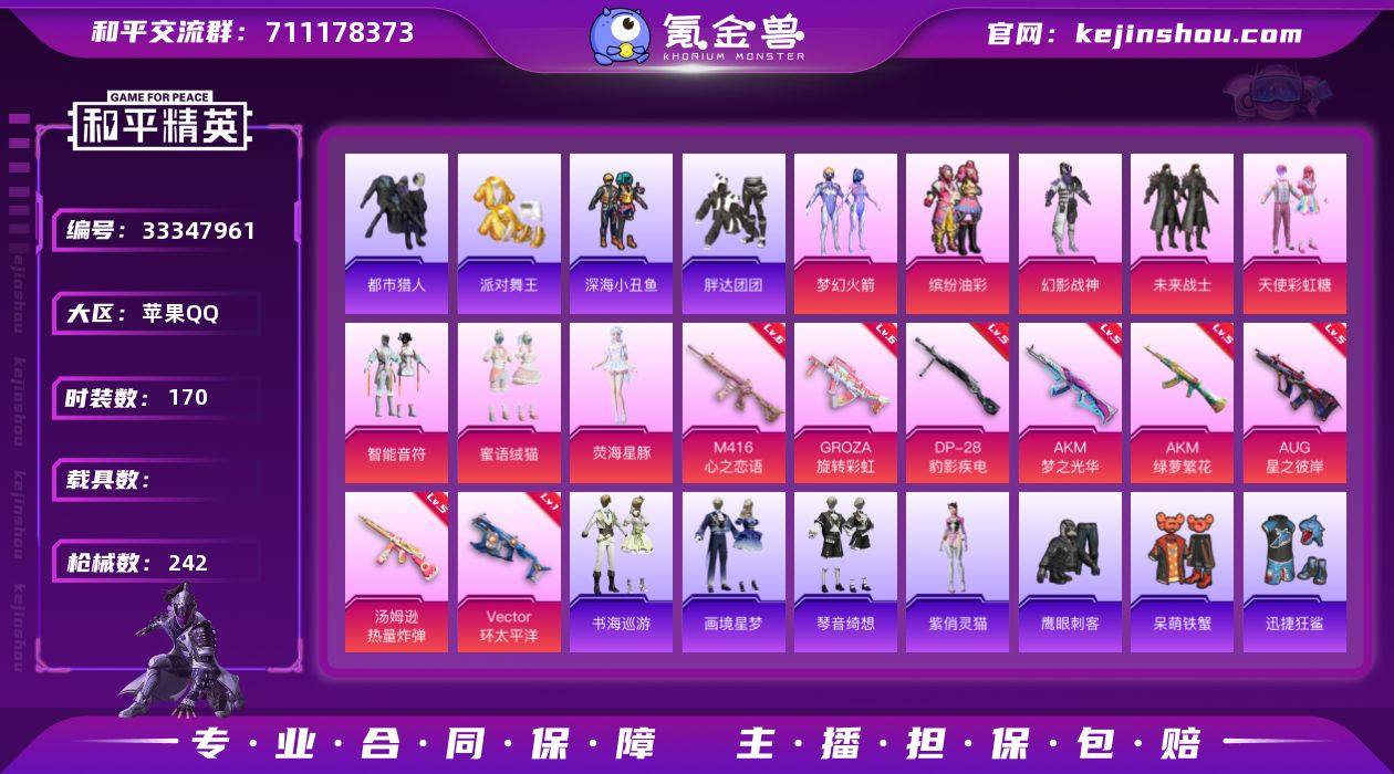 苹果 手Q-8粉装-11特效枪-0载具-1粉色飞行器-71434热力值-11王牌印记-170套装-242枪皮 【热门品类】:粉装-梦幻火箭,粉装-缤纷油彩,套装-浪漫天命,套装-都市猎人,套装-派对舞王,套装-深海小丑鱼,套装-小丑鱼,角色-军刀雅典娜,套装-胖达团团,套装-忍者信条,套装-龟仙人,套装-暗影哥特,熔岩游骑兵连帽夹克 【粉色套装】:粉装-幻影战神,粉装-未来战士,粉装-天使彩虹糖,粉装-梦幻火箭,粉装-智能音符,粉装-缤纷油彩,粉装-蜜语绒猫,角色-荧海星豚 【粉色枪皮等级】:AKM-梦之光华(五级),AKM-绿萝繁花(五级),M416-心之恋语(六级),GROZA-旋转彩虹(六级),AUG-星之彼岸(五级),UMP45-萌骑冒险(二级),Vector-环太平洋(一级),汤姆逊-热量炸弹(五级),Mk14-福马献瑞(五级),DP-28-豹影疾电(五级),信号枪-金乌曜日(一级) 【粉色枪皮】:AKM-梦之光华,AKM-绿萝繁花,M416-心之恋语,GROZA-旋转彩虹,AUG-星之彼岸,UMP45-萌骑冒险,Vector-环太平洋,汤姆逊-热量炸弹,Mk14-福马献瑞,DP-28-豹影疾电,信号枪-金乌曜日 【粉色飞行器】:炫彩糖果飞行器 【粉色降落伞】:幻影战神降落伞,甜心宝贝降落伞,梦幻火箭降落伞,星之彼岸降落伞,齐天大圣降落伞,洛神天...